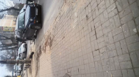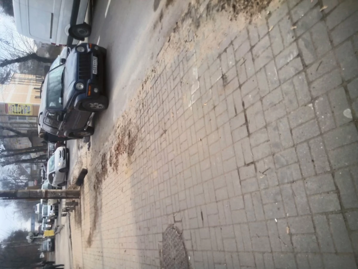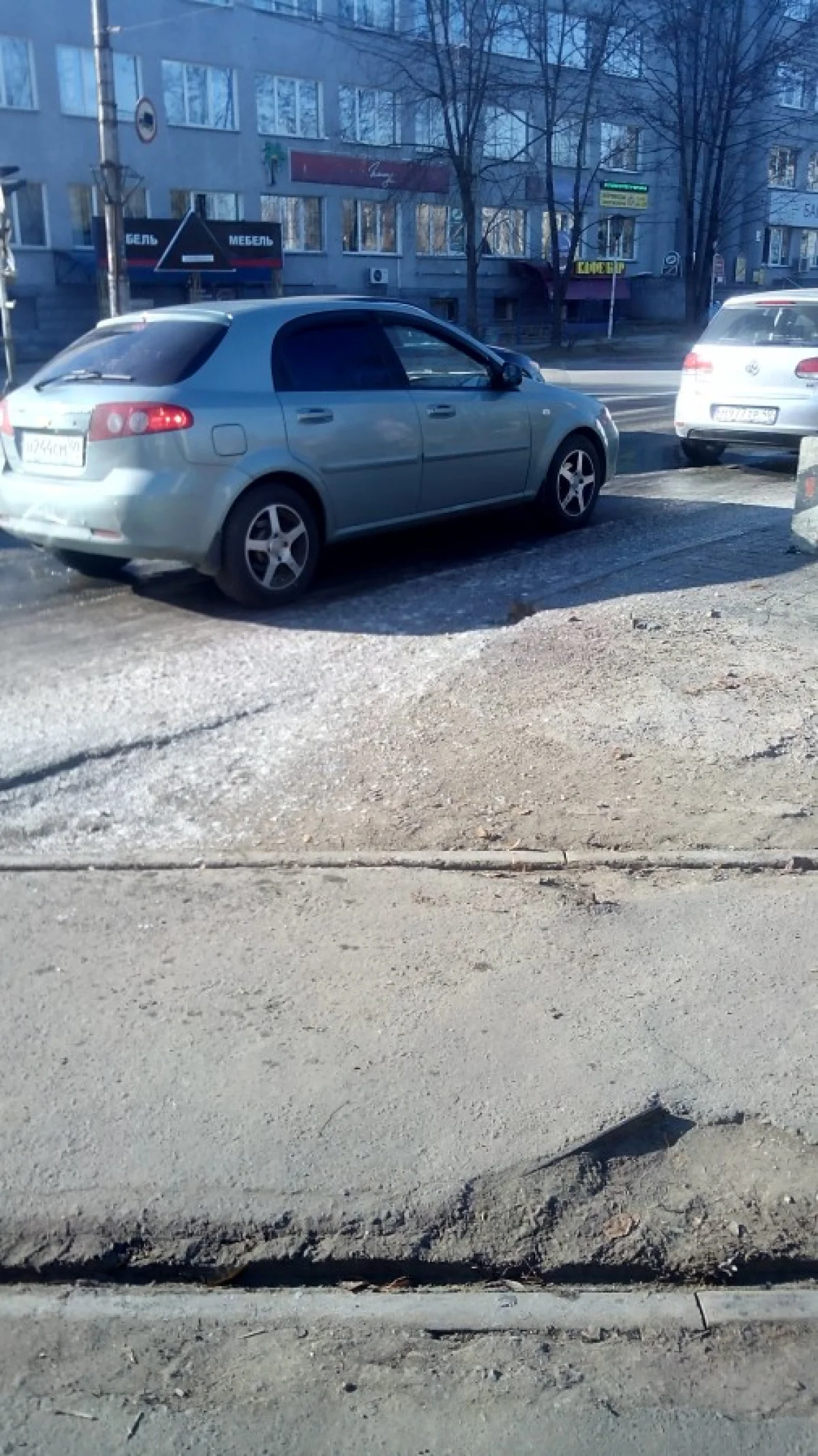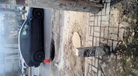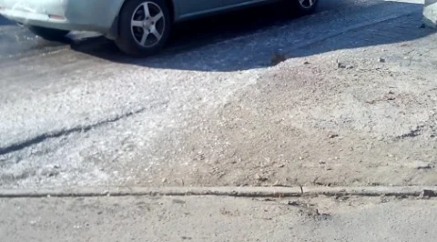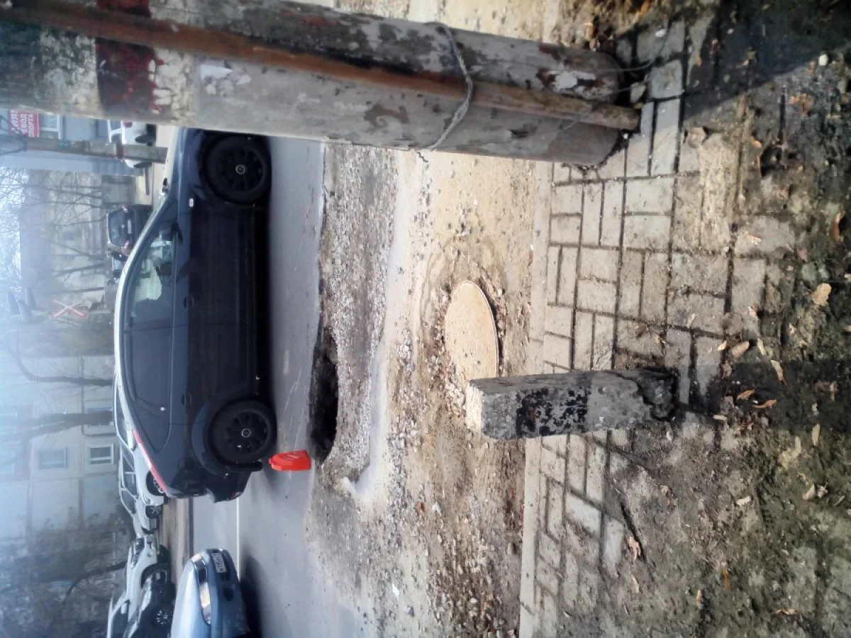 На переезде на улице Карла Либкнехта провалилась земля после работ по устранению течи из люка. В результате водитель, словивший эту яму, грустно ходит вокруг своей машины, фотографирует и придумывает все новые и новые матерные выражения в адрес тех, по чьей вине яма образовалась.