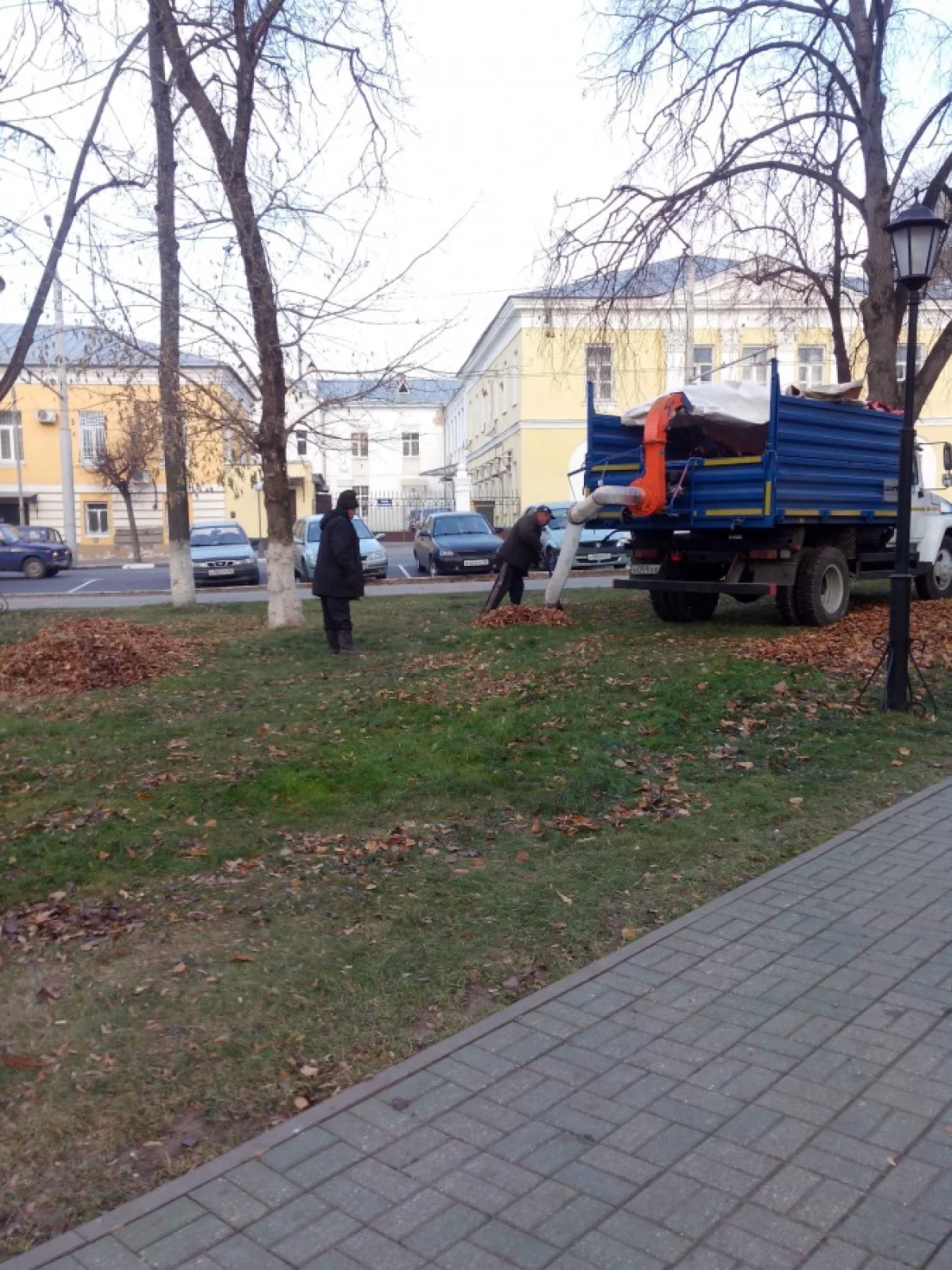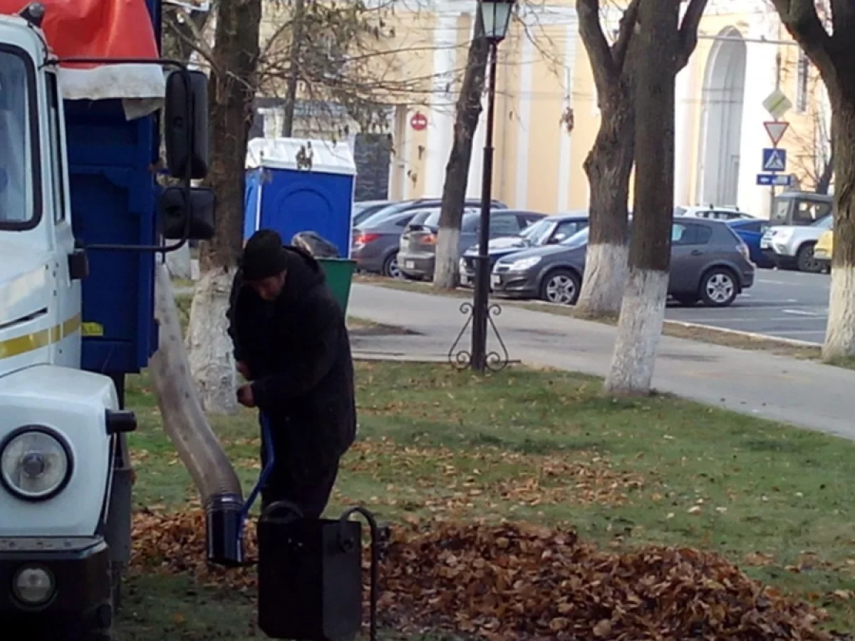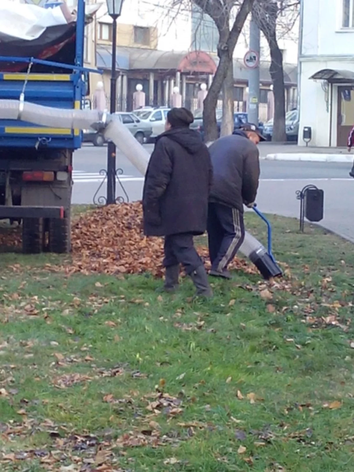 Сегодня утром в 09:30, находясь в сквере, рядом с "Госьтиными рядами". Наблюдал уборку опавшей листвы. Как можно заметить по фотографиям, прогресс дошёл и до нашего города. Ура Товарищи!