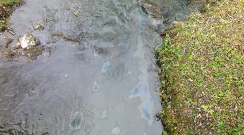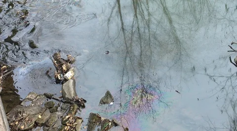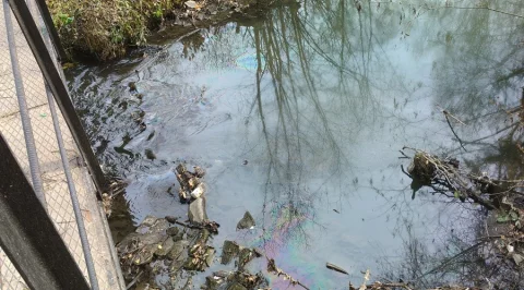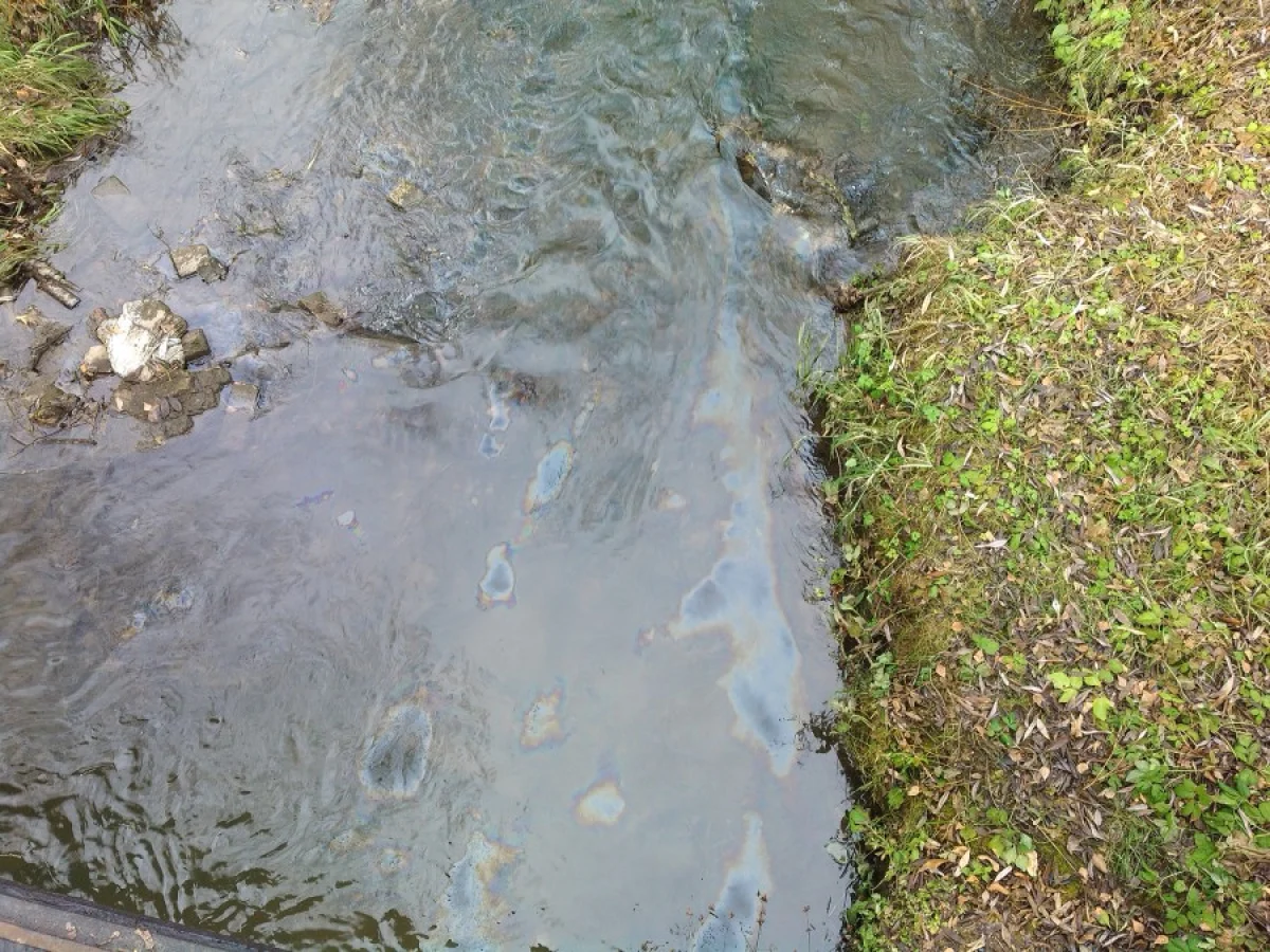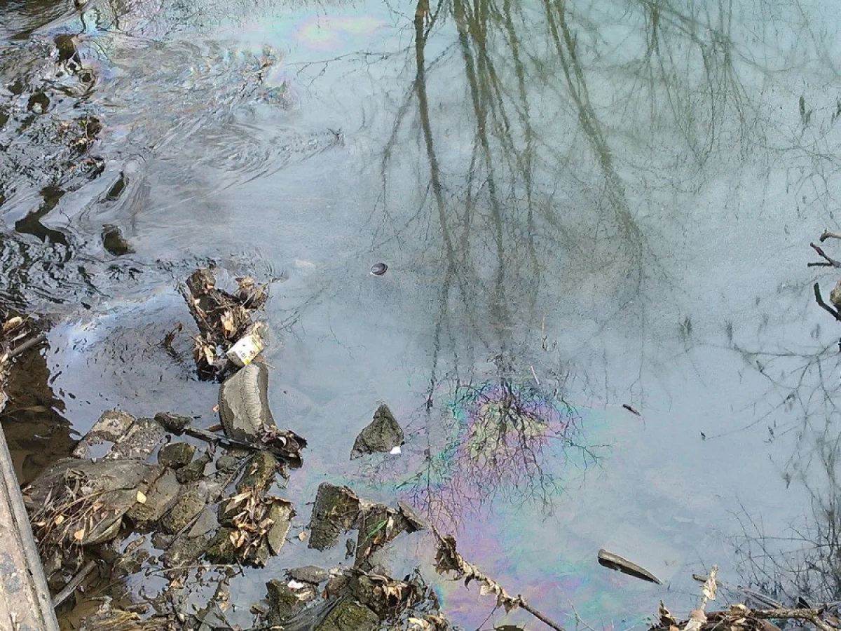 Около школы №27 г. Калуга, ул. Карьерная, д. 2 в реку Терепец уже не первый день сливают какие то отходы (мазут,масло или что-то еще).Фото сделано на железном мосту через данную реку, напротив школы