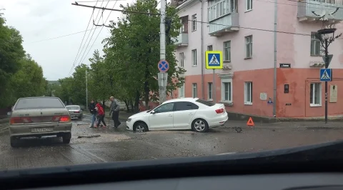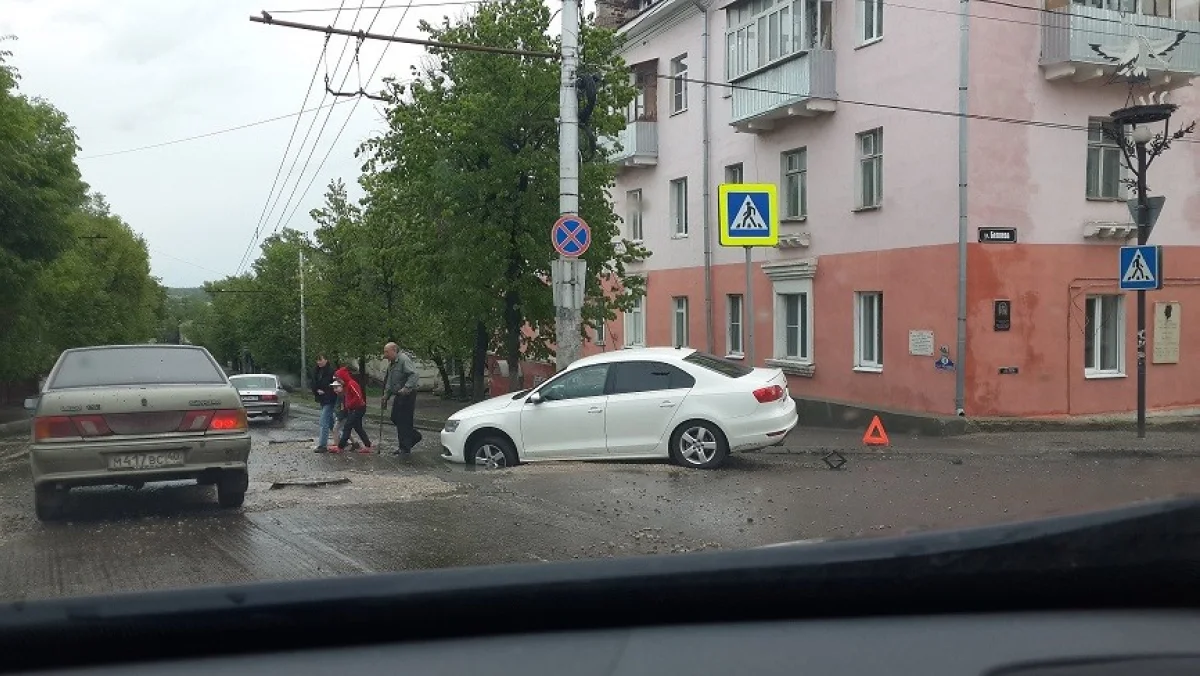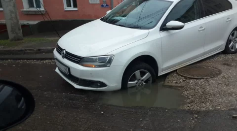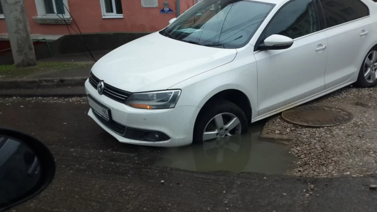 при выезде с ул. Беляева г. Калуги. на улицу С. Щедрина, водитель автомобиля фольксваген, стал жертвой ямочного ремонта. попав (извините за тавтологию) в ту самую яму.