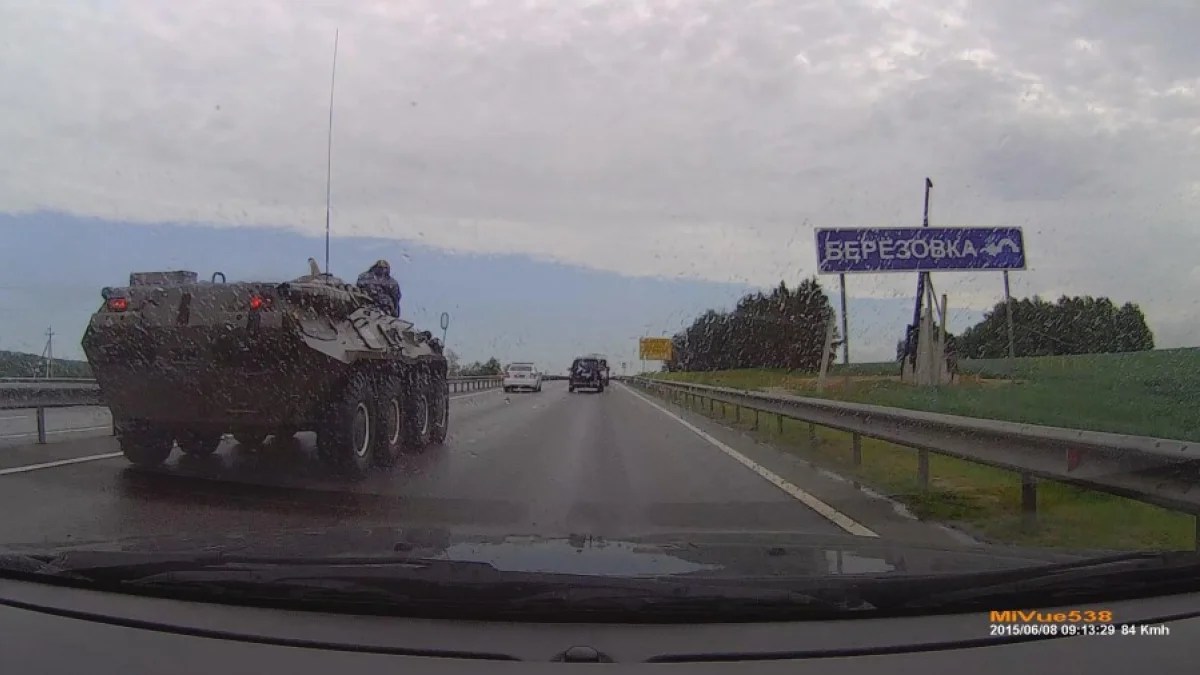 Утром, по дороге в Наукоград, встретил колонну с БТРом в составе.