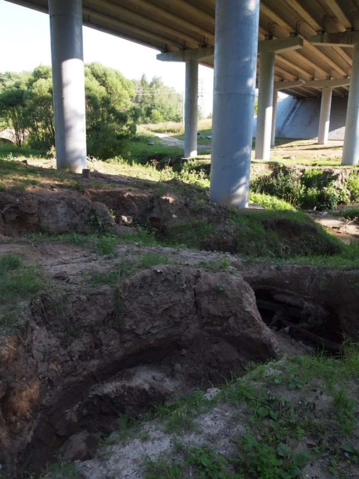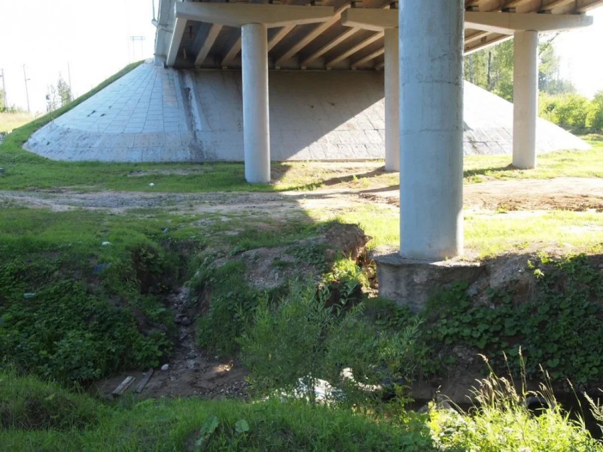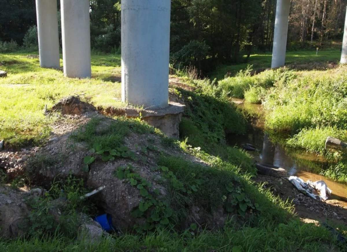 Если я верно понял и оценил обстановку на месте, то вот эти промоины возможно образовались из-за того, что вода, которая вытекает непосредственно с этого моста и с "ливневых баков", просто ищет дырочку и хочет попасть в ручей Вырка, а земельная почва под эстакадой уж дюже податлива этим потокам, вот и получились такие результаты... Но так же может быть всё что угодно их причиной!