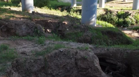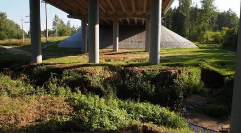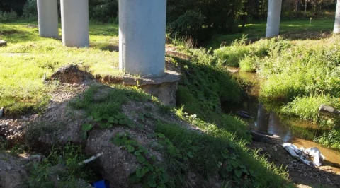 Но вот уже обратно собравшись было выезхать на автотрассу Калуга-Перемышль, после посещения туристической поляны, я всё же кое-что странное увидел. А именно, что основание автомобильной эстакады, которая находится над ручьём Вырка, имеет очевидно явные промоины и эрозии! В некоторых местах они более чем внушительны. И если в случае с промоинами под Путепроводом на ул.Московская в Областной Столице КО РФ, о которых ранее я писал заметку ( https://www.kp40.ru/narnews/ireport/33332/ ), спец.органы и народные специалисты говорили мне, что там всё в норме и возможно не будет иметь плохих последстий, то вот насчёт этих промоин пока не всё понятно.