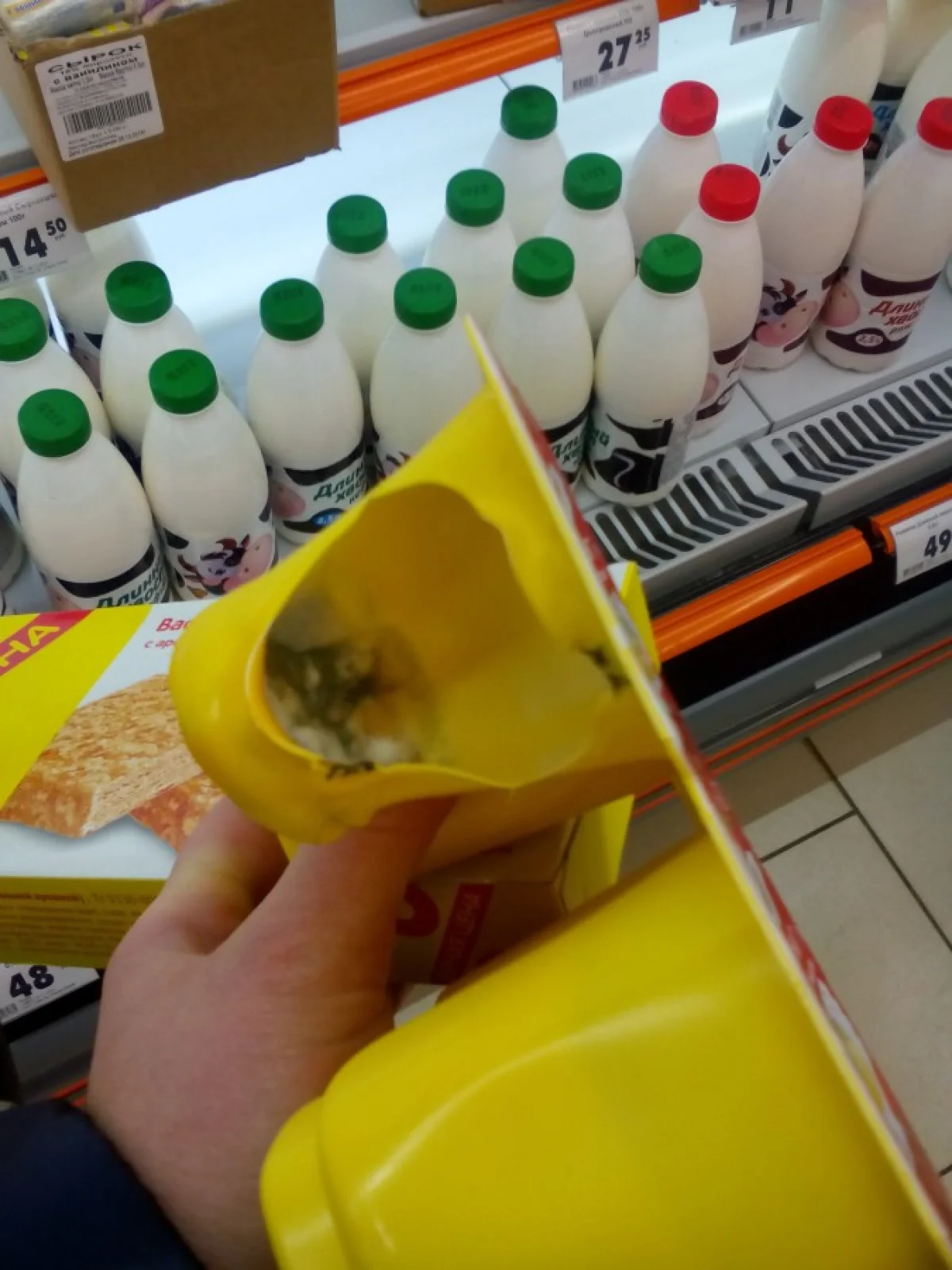 Добрый день! Живу в городе Кондрово. Во вторник после работы зашла в сетевой универсам, расположенный в центре города....и среди товара увидела на полке расплавленный стакан пудинга (см.фото). В среду не было возможности зайти в данный универсам, зашла в четверг.....о, чудо - "мой" стакан пудинга был на витрине, только передвинулся в другой ряд (!). Взяла данный товар и пошла на кассу. Девушка -кассир спокойной пробила ЭТОТ пудинг видя, что он испорчен. Далее было ещё интереснее...после моих слов, о том что я отказываюсь от данного товара, она от спайки из 4-х штук отломила 2 испорченных стаканчика, а 2 "нормальных" поставила мне обратно!!! И всё это было с невозмутимым видом! В итоге товар я вернула полностью, девушка-кассир даже не извинилась, а попыталась со мной открыть спор!!