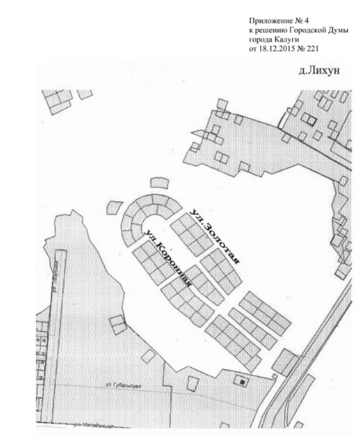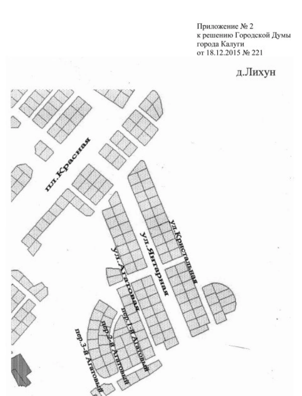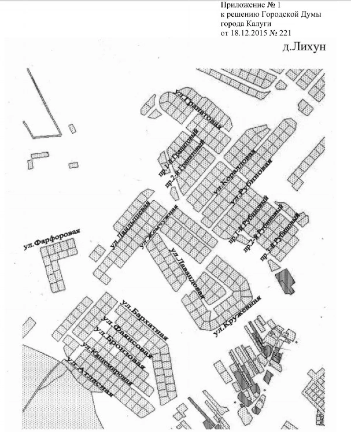 Решением Городской Думы г. Калуги от 18.12.2015 г. № 221 "О наименовании улиц, переулков, проездов, площади в д. Лихун муниципального образования «Город Калуга»" улицам д. Лихун присвоены следующие названия: