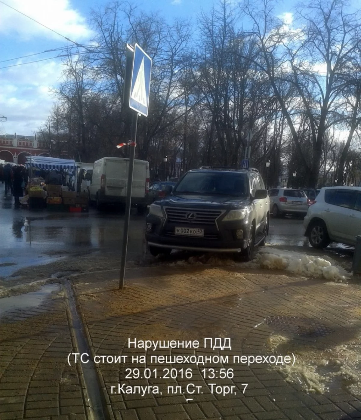 Прошу ГИБДД КО принять меры к нарушителю ПДД, который оставил ТС на пешеходном переходе 29.01.2016 в 13:56 (время фиксации) по адресу: г.Калуга, пл.Старый Торг, 7 (переход около Главпочтамта).
