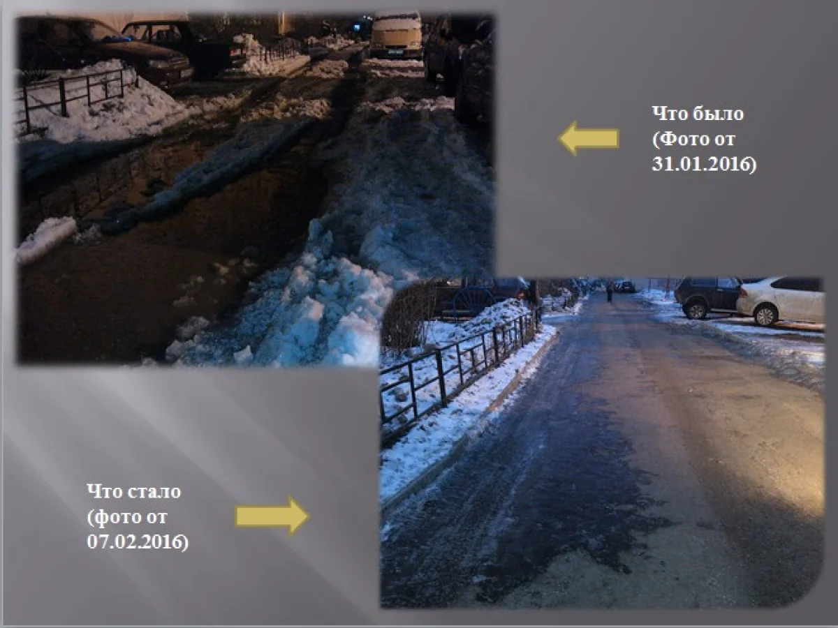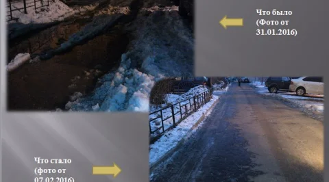 Вторая половина января ознаменовалась обильным снегопадом. Дворы засыпало, а дворники, ругая непогоду и управляющие компании за отсутствие надлежащего инвентаря, убирали снег, как могли. Но во дворе между домами по адресу пер Малинники 6 и 8, дорогу, ведущую на “большую землю”, никто не трогал. Пробраться от подъездов в магазин, ну там ещё куда, без опаски за здоровье было невозможно, а старикам, так и вообще нереально. Дворник объяснял ситуацию тем, что тут нужна техника и управляющая компания об этом знает. Там уверяли, что они пытались убрать снег трактором Белорус(а других у них нет), но мешали машины припаркованные(мертвым грузом), и настоятельно рекомендовали самим жильцам найти хозяев этих авто и заставить убрать с проезжей части. Жители, дабы избежать конфликта, обратились по телефону к участковому за помощью (найти хозяев авто и заставить убрать) и получили рекомендацию обратиться в ГИБДД для решения этого вопроса. Там жителям дали рекомендацию обратиться к участковому. Поняв, что спасение утопающих (в снегу)- дело самих утопающих, было решено написать тактично просьбу на листе формата А4 убрать мешающие авто(3шт.) и положили под «дворники» на каждую (не понятно, почему в управляющей компании пожалели бумагу и 5 минут времени так же разложить на машины накануне планируемой уборки, а ограничились мелко шрифтовыми объявлениями приклеенными сбоку от подъездов). Спасибо понятливым людям, сработало, убрали авто. Еще два дня бились с У.К. , звонили им, уже написали заметку в КП40 и предупредили, что на этом не остановимся, те уже начали бросать трубку, в общем потрепали друг другу нервы, а снег уже превратился в лед. Не знаем, откуда «выстрелило», но в СУББОТУ (несмотря на выходной) 6 февраля пригнали трактор (нанятый) и не Белорус. Четыре часа он боролся со льдом, самоотверженно, молодец, убрал все. Наконец-то, не прошло и двух недель! ( Хронология жизни снега во дворе дома по пер. Малинники 6 представлена на фото). На дворе 21 век, а у нас в диковинку средства малой механизации, без которых убирать дворы все сложнее. И ещё, разве не достаточно того, что люди платят за ЖКХ немалые деньги, так ещё нужно с нервотрепкой добиваться, чтобы в управляющей компании выполняли добросовестно свои обязанности?