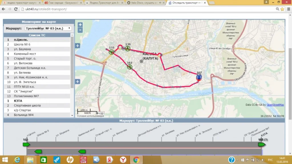 Несколько дней назад стало возможным отслеживание работы троллейбусов и муниципальных автобусов в режиме онлайн. Судя по всему, сервис, был разработан специально для УКТ и не был интегрирован в систему Яндекс - транспорт. Однако, теперь все желающие могут наблюдать за движением городского транспорта на сайте http://ukt40.ru/otsledit-transport/. Стоит отметить, что он отображает точное количество единиц транспорта, находящееся в данный момент на маршруте. Зеленым цветом отображен транспорт - находящийся на маршруте, синим - отстаивающийся на диспетчерских, красным - идущий в депо или неисправный. Замечено, опоздание отображения от реального времени на 2-3 минуты. Кроме того, с мобильных устройств сервис периодически "лагает", но с ПК работает хорошо.