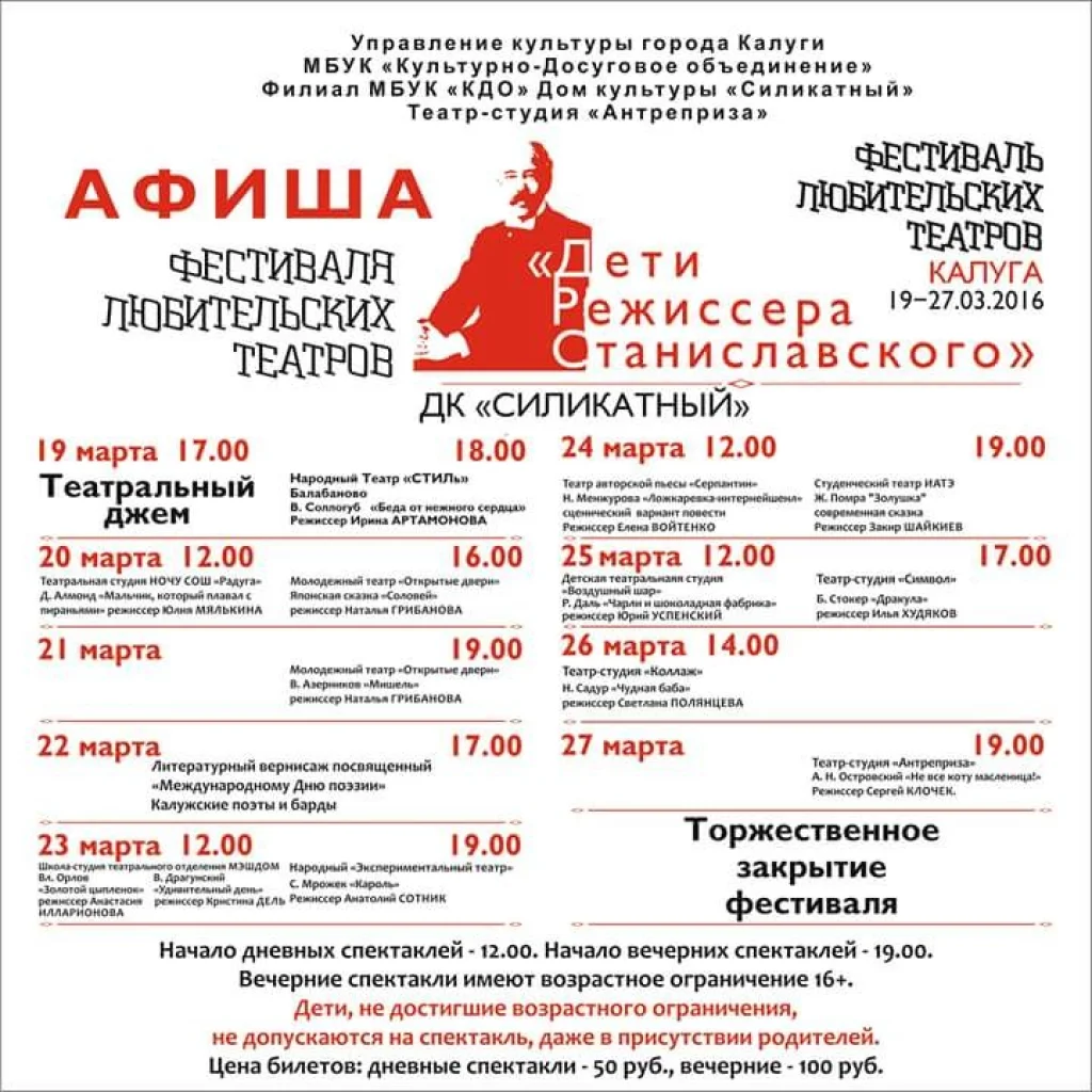 На этой неделе в ДК "Силикатный" проходит фестиваль любительских театров "Дети режиссера Станиславского". Скажем так, я приятно удивлена. Никогда бы не подумала, что в Калуге помимо облдрамы столько талантливых коллективов. К сожалению, нет возможности побывать на всех спектаклях, но была на открытии и с удовольствием смотрела постановку "Беда от нежного сердца" балабановского театра "Стиль". Режиссер Ирина Артамонова (без подколов, пожалуйста)). Совершенно в восторге была от спектакля "Мишель" калужской труппы "Открытые двери" Наталии Грибановой. Простите за прямоту, но не всегда с таким позитивом уходишь со спектакля профессионалов нашего "большого" театра. Здесь же... Как вам сказать: никакого намека на "самодеятельность". Многое актеры украсили бы и большую сцену. Но это , конечно, не мне решать. Просто скажу: Спасибо за творчество. Молодцы. Думаю,что на этом фестивале впереди еще много интересных работ.