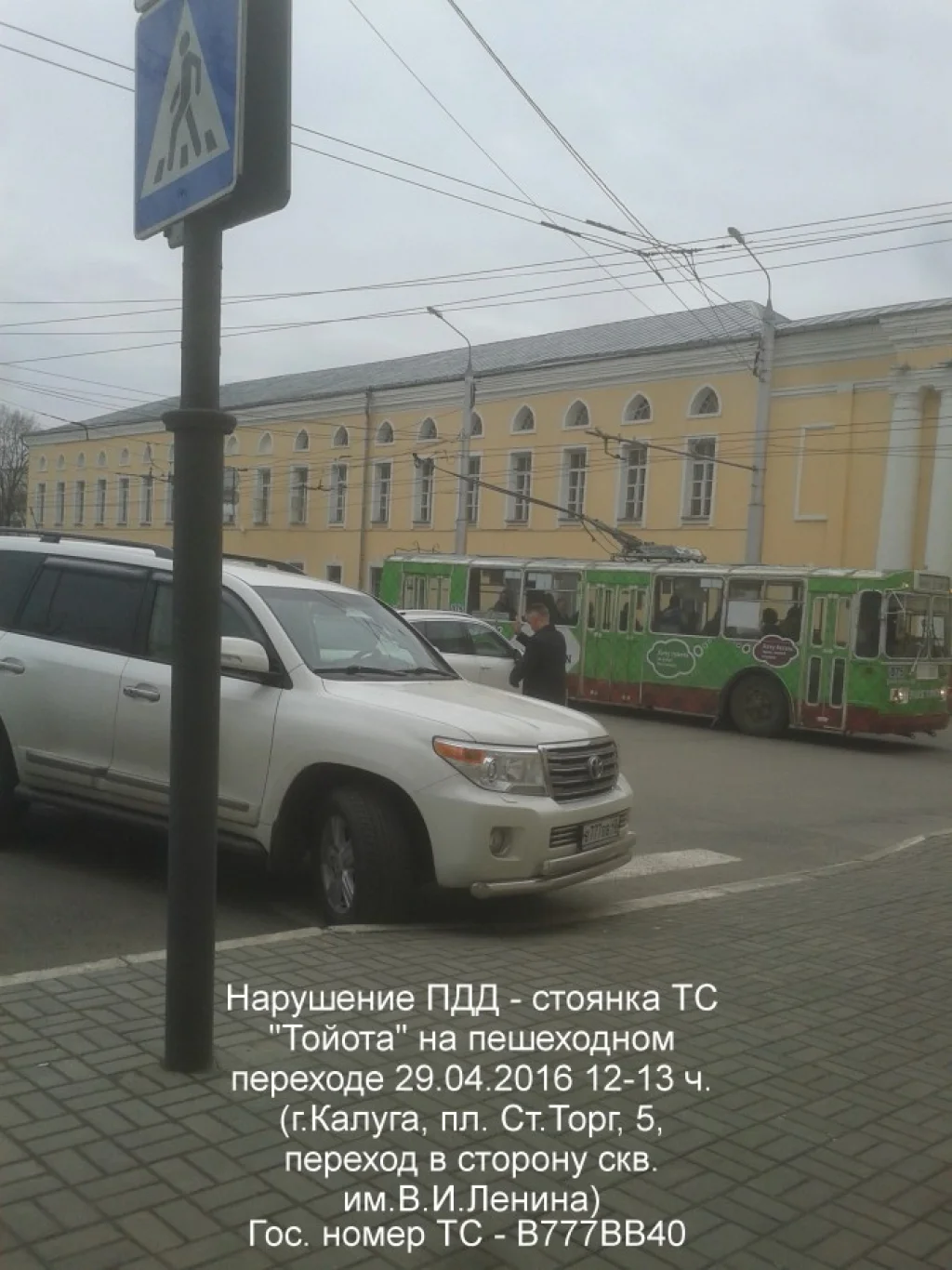 29.04.2016 в 12-13 ч. водитель а/м "Тойота" гос.номер В777ВВ40 совершил грубое нарушение ПДД: оставил авто на пешеходном переходе по адресу: 248000, г.Калуга, пл.Старый Торг, д. 5 (переход в сторону сквера им. Ленина). Фото «крутого» авто прилагается. Прошу ГИБДД принять меры.