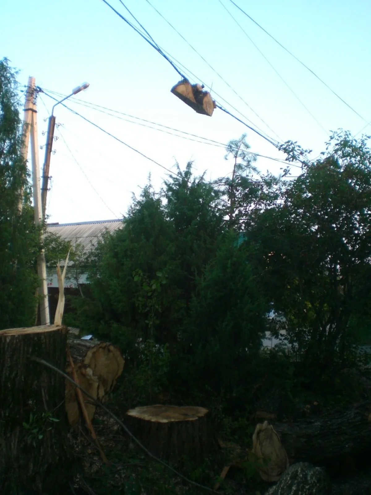Городские службы спилили огромную ракиту на пер.Северном неделю назад(23июля).Огромные брёвна остались лежать на месте.Один небольшой "кусочек"висит на проводах.Периодически приезжают какие то люди на спецмашинах ,чешут свои головы(репы) и уезжают,говоря "Это не наше-убирайте сами".