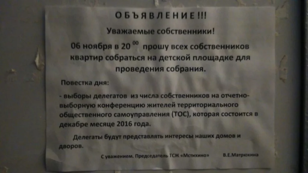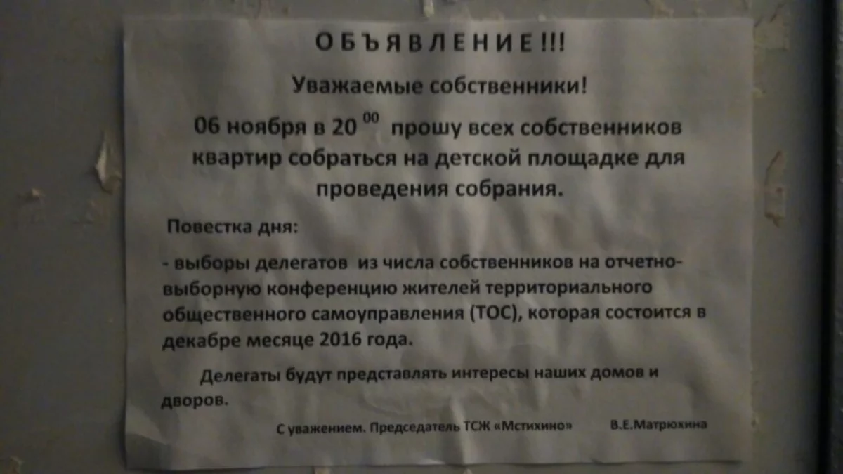 Однако, 6 ноября 2016 года, на подъездах дома ул. Мстихинская, 8 висело объявление о повторном переизбрании делегата с подписью председатель ТСЖ "Мстихино" Матрюхина В.Е., но дело в том, что официально организации не существует с декабря 2015-го года. А зачем госпожа Матрюхина В.Е. ввела в ход такую инсинуацию - неизвестно, остается догадываться что здесь, возможно, есть чья-то невидимая рука, которой выгодно продвинуть "своих" кандидатов на конференцию. И управление по работе с населением не контролирует должным образом процессы происходящие в деревне, а на что они вообще тогда нужны - для галочки?