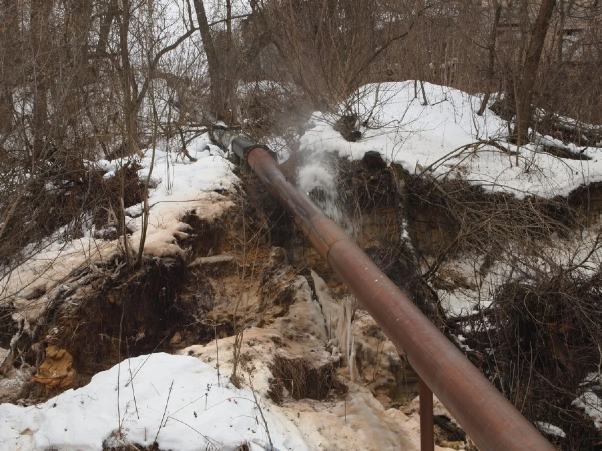 в районе набережной Яченского водохранилища (рядом с замороженным строительством второй очереди Государственного музея истории космонавтики им.К.Э.Циолковского и не далеко от городской площадки для дрессировки собак). Похоже, что протечка происходит уже относительно давно, об этом говорит стойкий неприятный запах и большая площадь намокания почвы и снегового покрова нечистотами.
