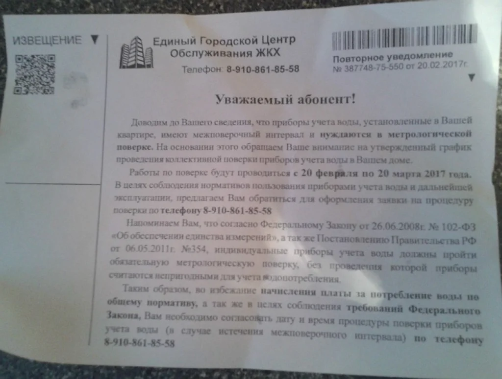 На днях, в почтовом ящике обнаружилось интересное уведомление, в котором, ссылаясь на статью закона РФ и постановление правительства РФ, "во избежание" и "в целях соблюдения", практически навязывается поверка приборов учёта воды.