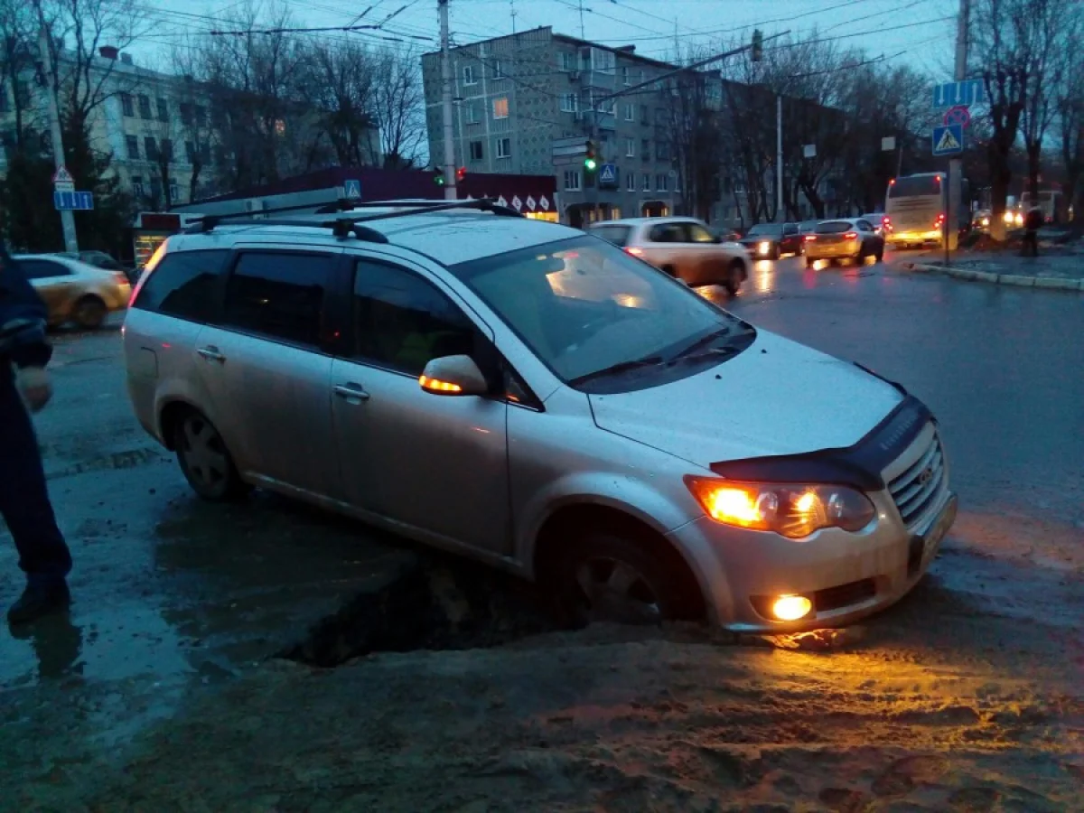 За последнее время водоканал перерыл половину города. Вот Перекресток улиц Московская - К. Либхнехта. Машина пошла на погружение под землю, директору водоканала пора бы место освободить. Смысл, что улицу перекрывали, все равно опять все через одно место.