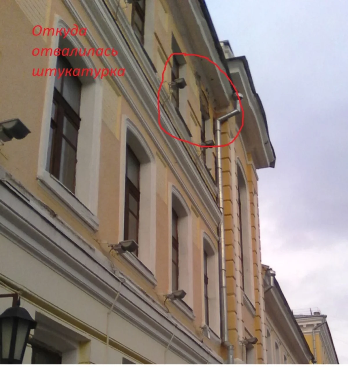 Не знаю упали ли эти куски штукатурки кому нибудь на голову или нет. Надеюсь, что нет. В воскресенье 19 марта я их заснял лежащими на тротуаре, а 20-го пешеходы всё так же беспечно там ходили. Нет ли какой опасности, что еще отвалится?