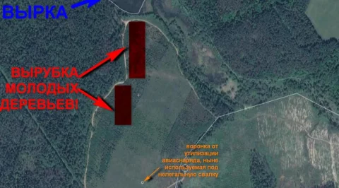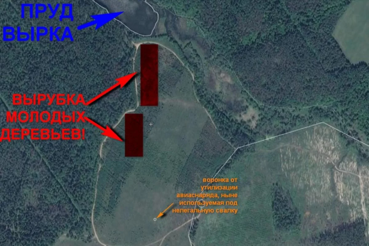 В этот раз производится вырубка молодых деревьев в районе пруда Вырка, находящегося в небольшом удалении от Областной Столицы КО РФ (см.карту)