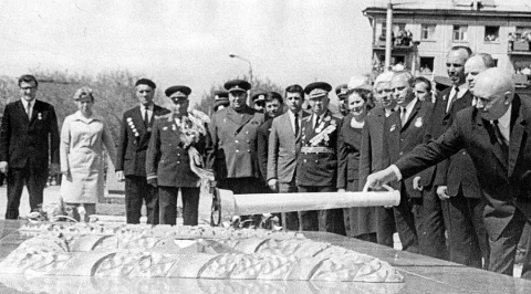 3. 9 мая 1970 года. Первый секретарь Калужского обкома КПСС А.А. Кандрёнков зажигает Вечный огонь на Площади от факела зажжённого и привезённого от Вечного Огня у Кремлёвской стены в Москве. Фото из архива Вячеслава Николаевича Петровского. Снимок, предположительно, сделан фотокорреспондентом газеты «Знамя» и Полным кавалером Ордена «Слава» всех трёх степеней Владимиром Андреевичем Петровым.