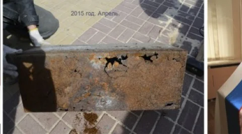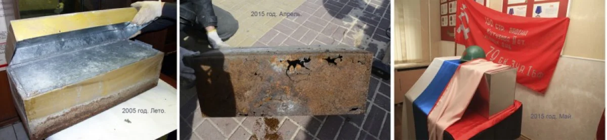 5. Капсула с останками безымянных бойцов. На первом снимке, сделанном в 2005 году капсула, которую при ремонте комплекса Вечного Огня, рабочие из Средне-Азиатских республик, по незнанию, выбросили в строительный мусор. Совершенно случайно, проезжая мимо на своём лисапете, я увидел странную, металлическую коробку. Вместе с начальником Поста №1 её перенесли на Пост. На снимке видно, что нижняя (донная) часть уже сильно подвержена коррозии. Но тогда капсулу просто вернули на место после ремонта В.О. Второй снимок – состояние капсулы с останками (днище) в апреле 2015-го. Капсула с 1975-го – сорок лет лежала на поверхности у подножия ВО. Сквозь проржавевшее днище было можно разглядеть… три целых больших берцовых кости и ещё одну сломанную. Третий снимок – строители из СМУ-3 не рискую тронуть капсулу, сделали для неё новый корпус, в который и вложили первую с останками. Эту капсулу и захоронили у В.О.