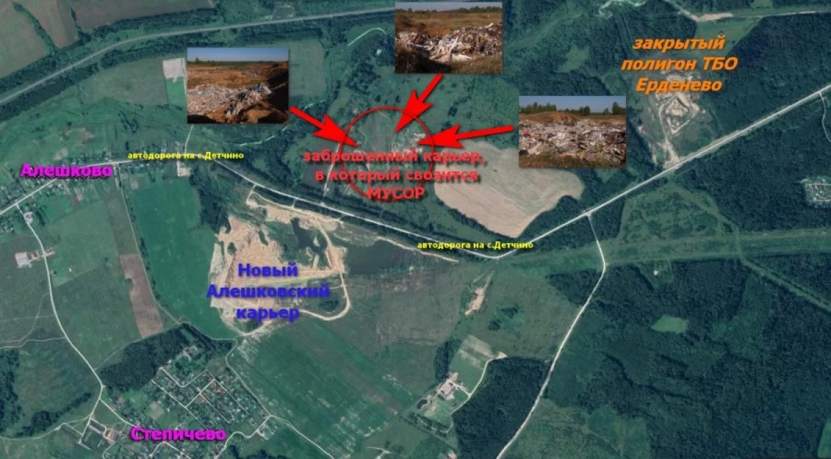Итак, да, в отработанный карьер в районе деревни Алешково (Малоярославецкий район, Калужская область РФ) свозят мусор. Как говорят местные жители, теперь вывозы происходят ночью (раньше и днём не брезговали), вероятно, что этот мусор из МО РФ, так как свалочные тяжеловозы с номерами того региона (в упомянутых пабликах имеются HD-видеозаписи из автомобильных видеорегистраторов, подтверждающие это).