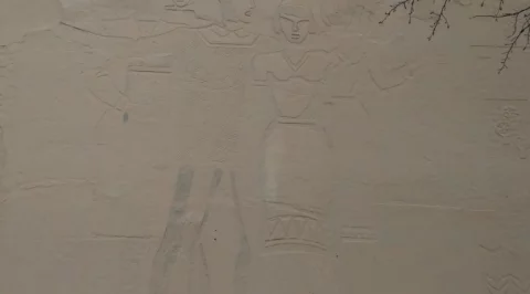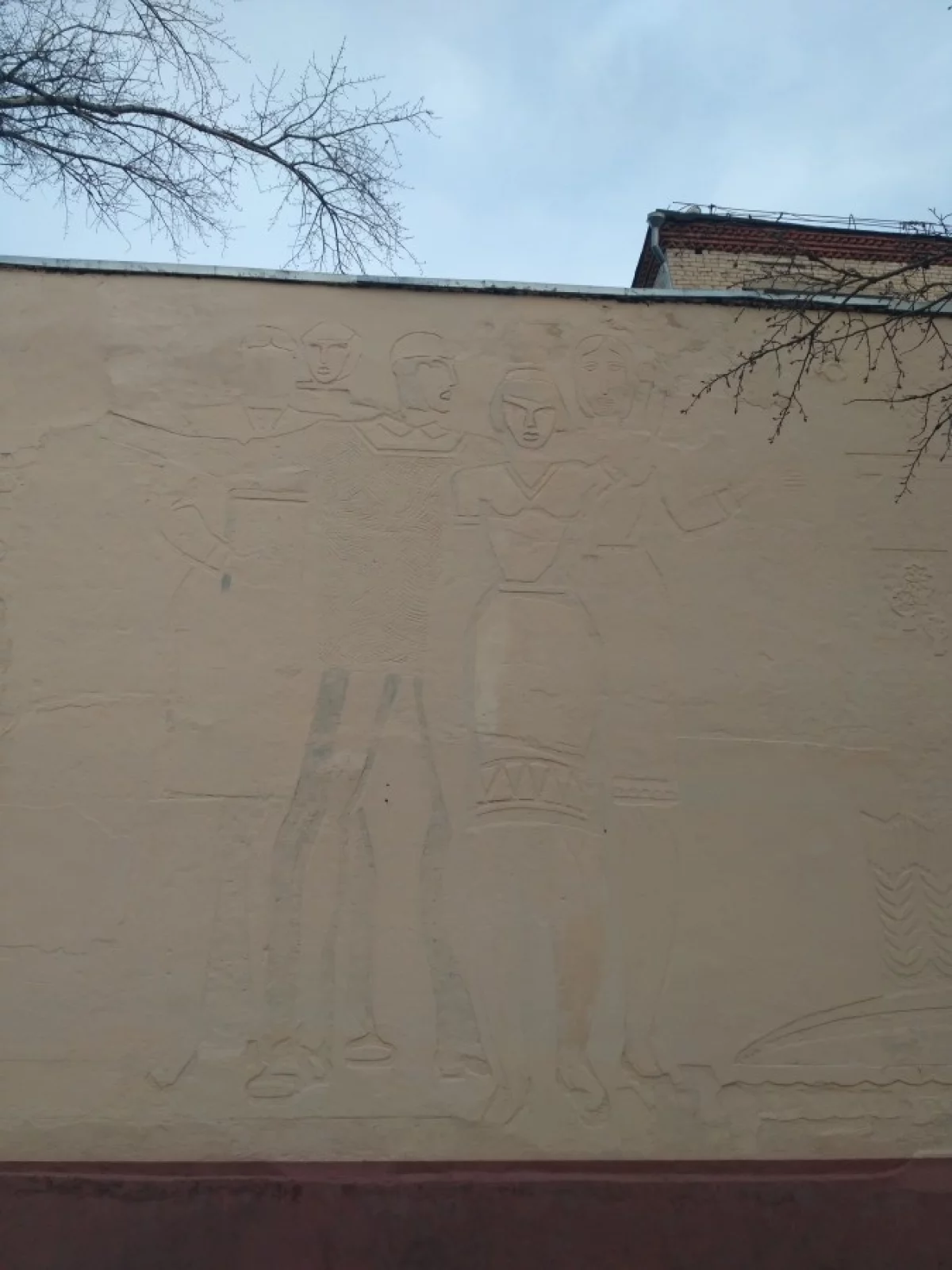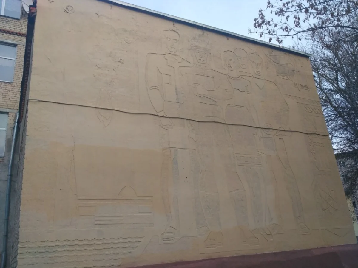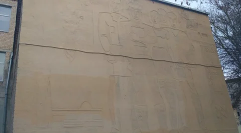 Пока в "высоких сферах" решается вопрос о реставрации панно на ул. Пушкина, в Ромодановских двориках на фасаде "Калужского кооперативного техникума" летом произошёл "ремонт" похожего по технологии исполнения барельефа. Представители рабочих специальностей ныне напоминают живопись Древнего Египта с иллюстраций учебников истории. В цвете нашел фото только на сайте техникума (http://www.kooptex.narod.ru/).