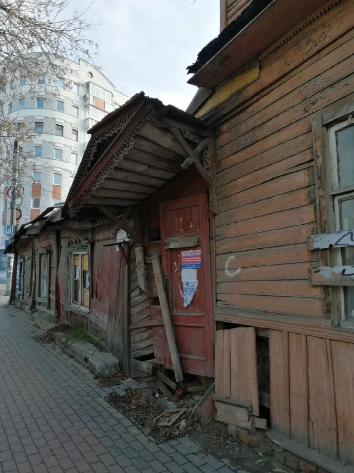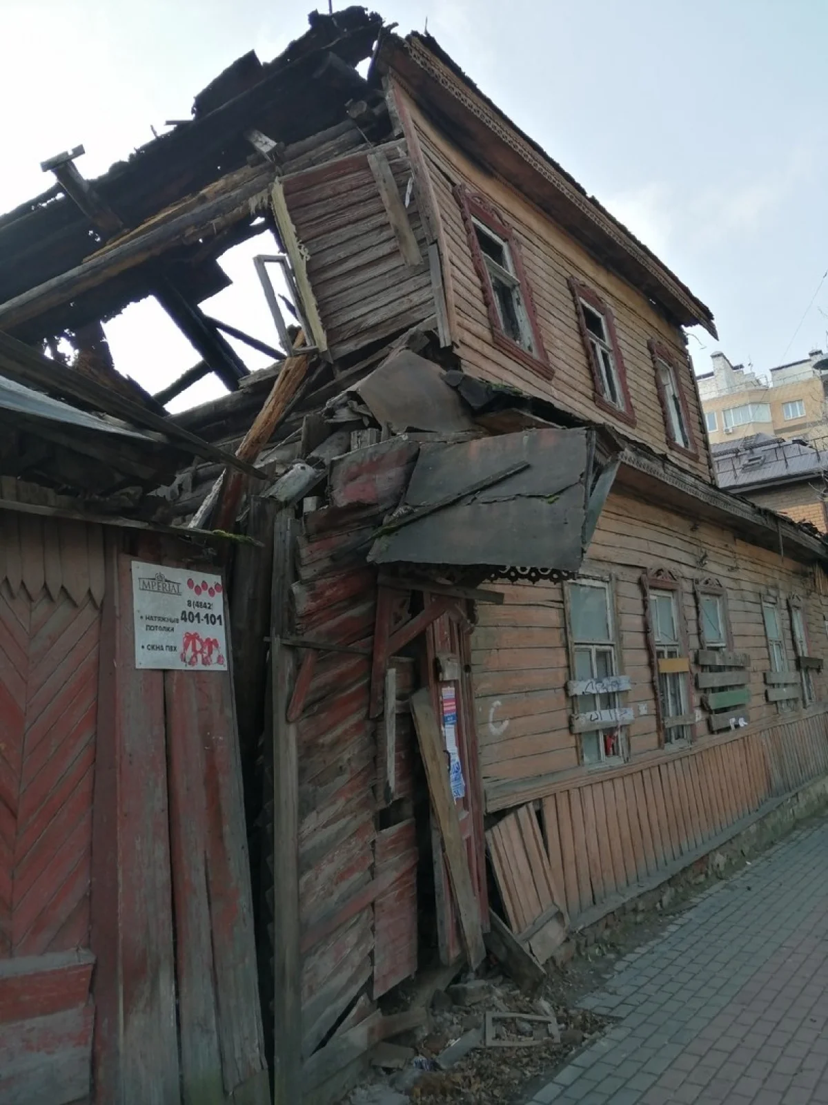 Перекрёсток ул. Тульской и Н. Козинской, старый, ветхий, полуразрушенный дом, козырёк которого почти отвалился и свисает над тротуаром. Того и гляди обвалился кому нибудь на голову... А там люди ходят.