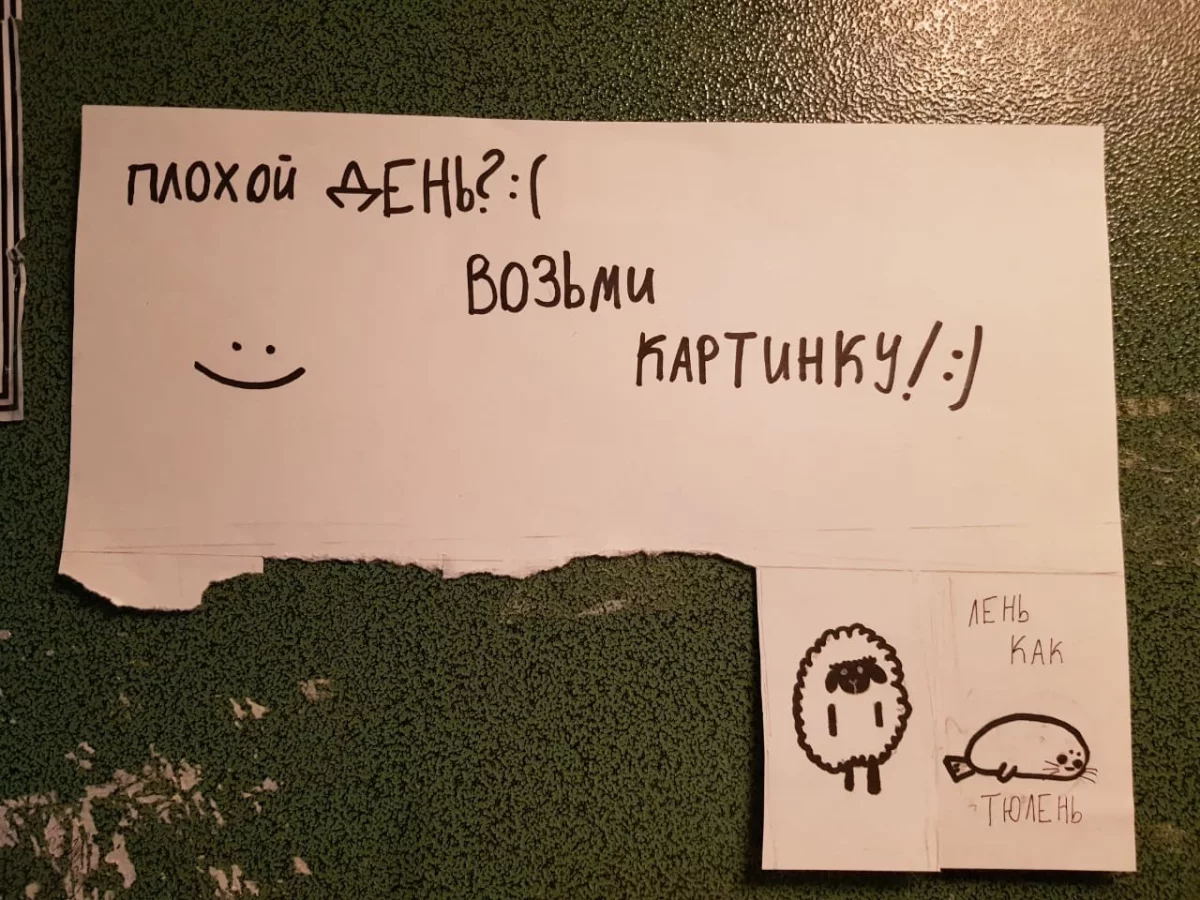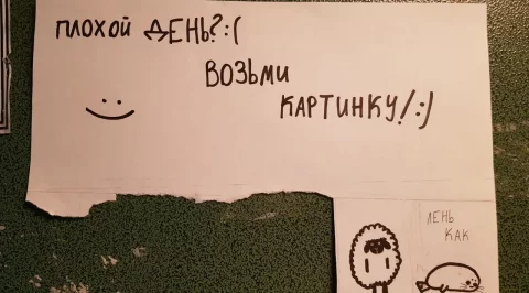 "Обнаружила сегодня утром в лифте своего дома на ул. Гагарина вот такое объявление. Улыбнулась. Удивилась. Ещё раз улыбнулась. И хотя утро у меня замечательное, не удержалась и одну картинку себе оторвала. Спасибо тебе добрый человек за отличное настроение!"