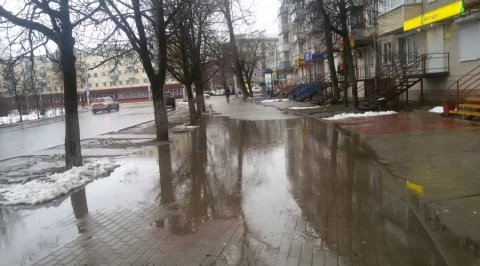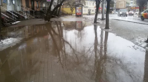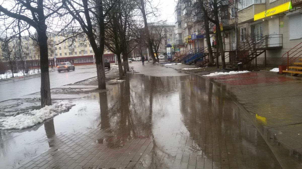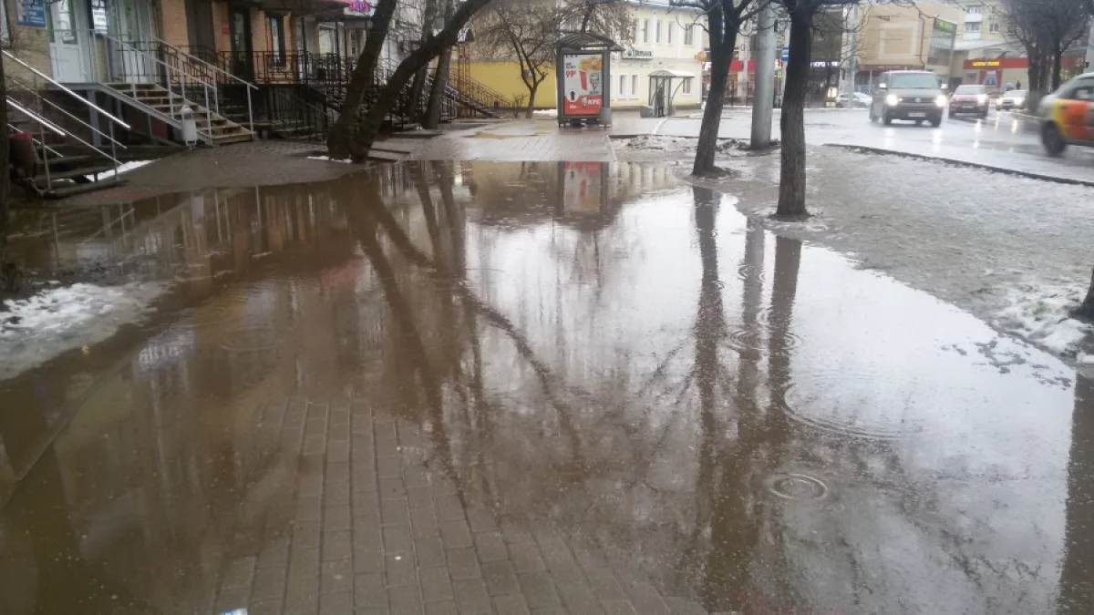 Пл. Победы. Мож ливневку,не?! Расчет уклона тротуара и газонной части выполнен не верно. За счет этого большое скопление воды. Тротуар полностью залит водой. Это не дело!