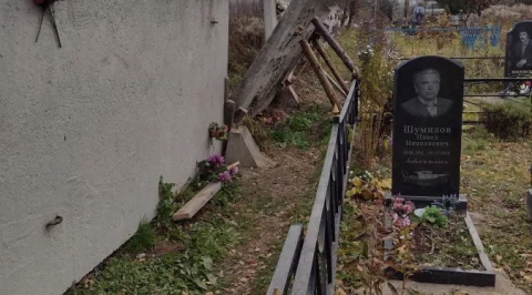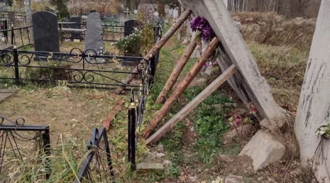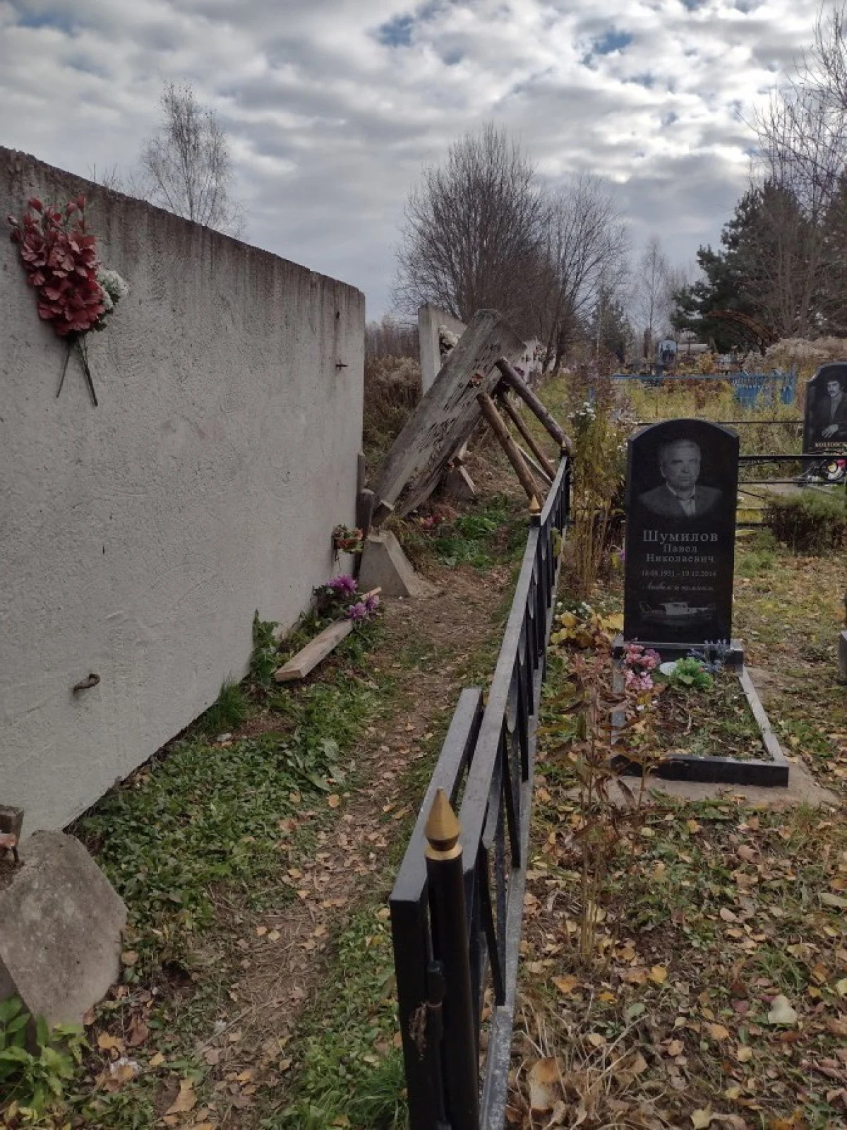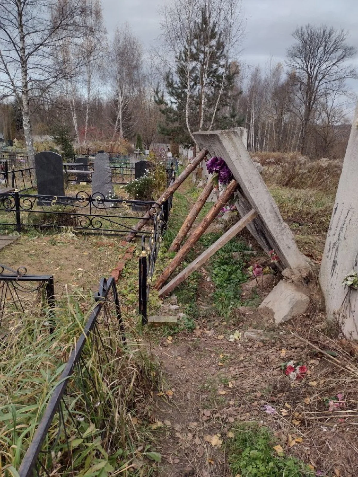 На противоположной стороне от дороги, на галкинском кладбище, ещё летом завалилась бетонная плита забора, после обращений, службы установили только подпорки, а поход затруднён, приходится перелазить через ограды могил.