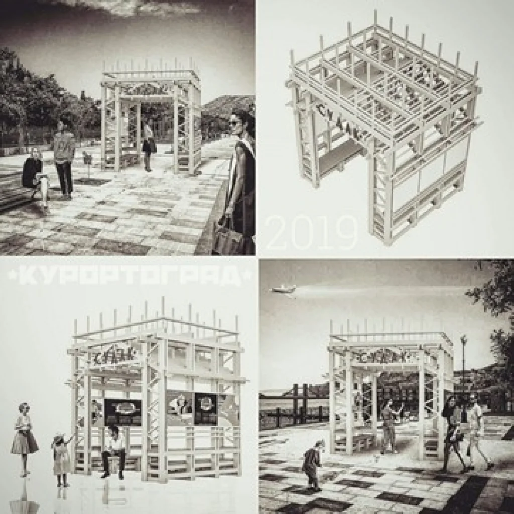 цитата:06.06.2019.«С моими молодыми коллегами из Крыма и Ростова-на-Дону разработали сезонный арт-объект для набережной прекрасного крымского города Судак. Деревянный портал — собирательный образ фортификационных механизмов, крепостных врат и приморских курортных павильонов. Традиция и Авангард.На боковых внешних внутренних плоскостях предусмотрены экспозиционные модули для уличных познавательных выставок. Подарок городу от влюбленных в Крым и Архитектуру единомышленников» — сообщил Алексей Комов.