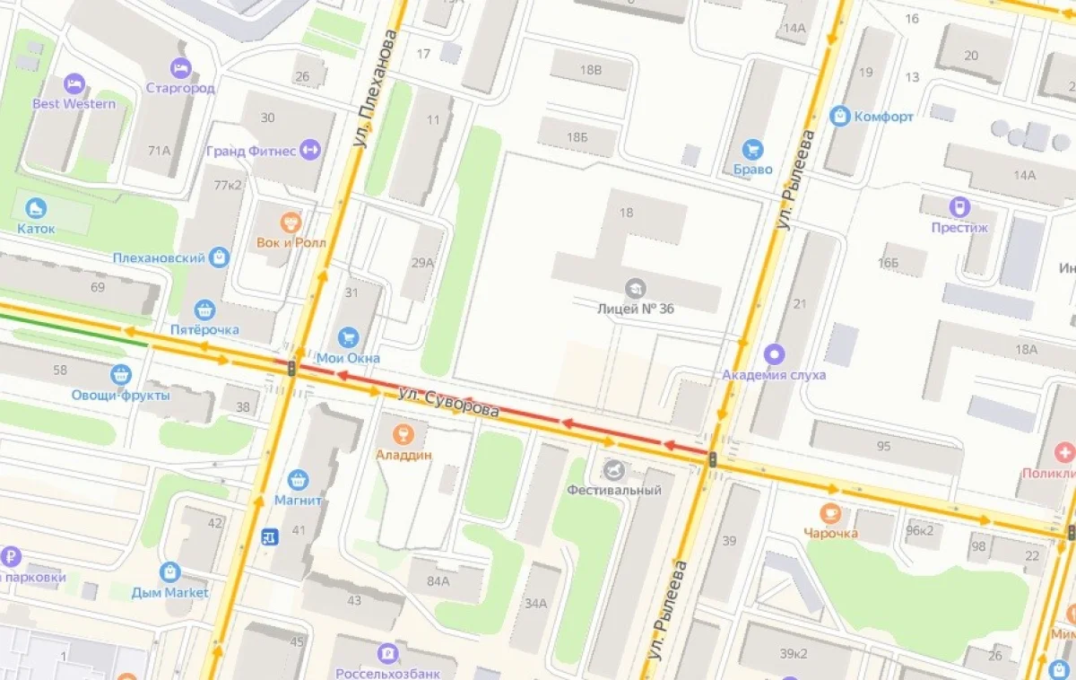 с изменением режима работы светофора на перекрёстке Суворова/Плеханова постоянно стало подстаивать Суворова между Рылеева и Плеханова. Поворачиваешь с Рылеева на Суворова (в сторону Плеханова) и сразу останавливаешься, упираясь в хвост небольшой пробки. Вот и на "пробках" оно красное. Может быть стоит ещё раз обследовать и немного подкрутить интервалы работы светофора назад?