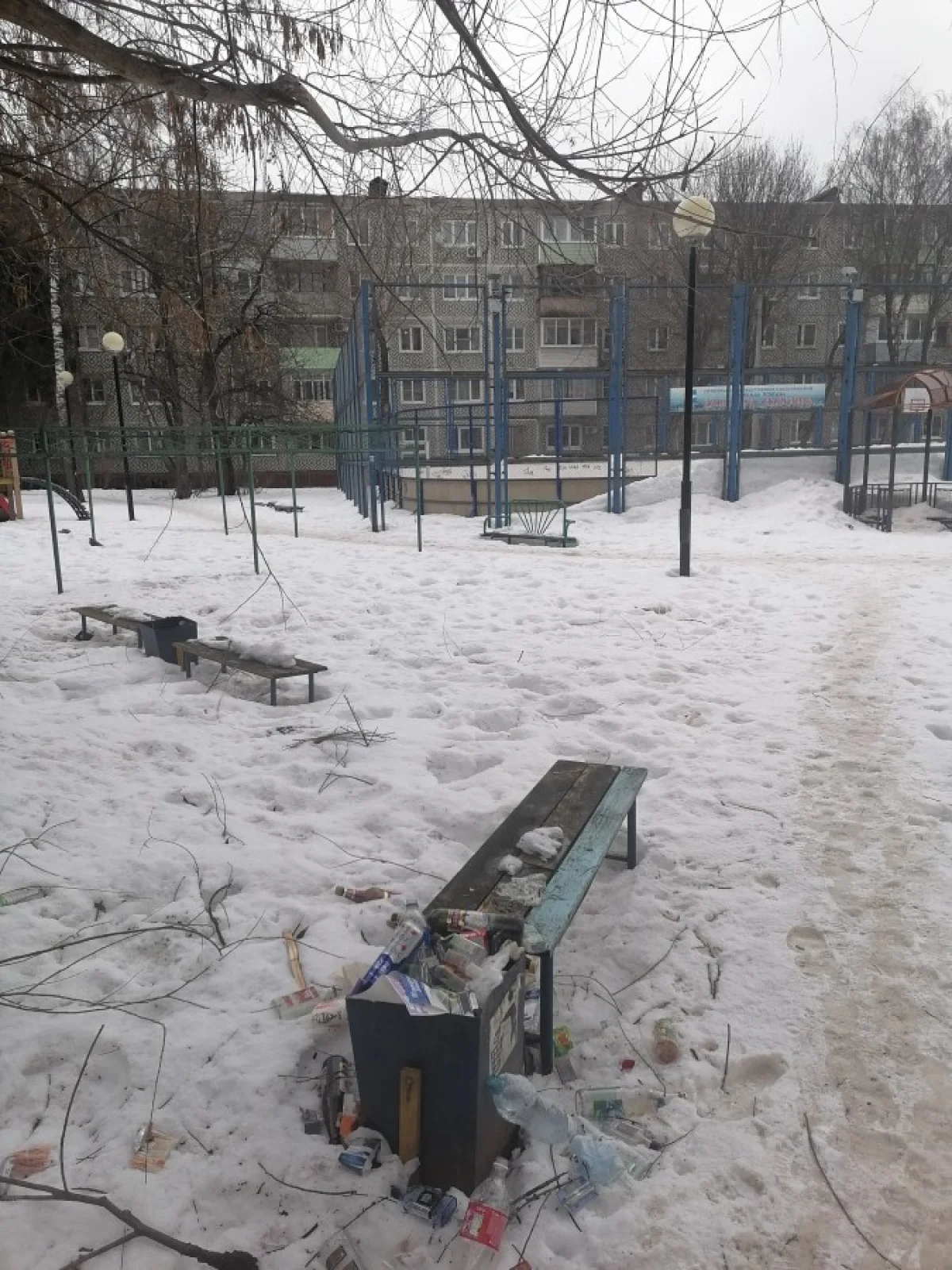 Двор Жукова 5. Судя по мусору, попойки там постоянные. А на Жукова 5 висит табличка "Участковый". Как так?