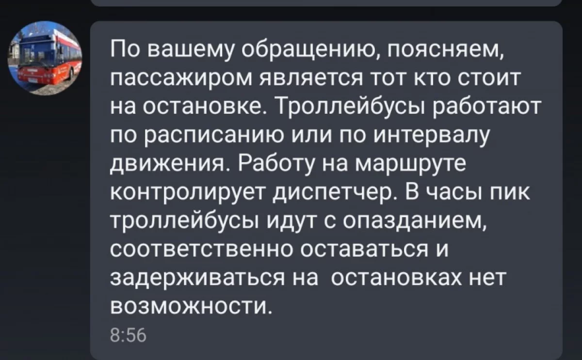 Официальный ответ представителей калужского троллейбуса на вопрос, почему транспорт на остановках стоит меньше минуты и людям ждущим когда им загорится зеленый сигнал светофора, приходится бежать на красный свет, чтоб успеть. А иначе троллейбус постоит 10 секунд и уедет.