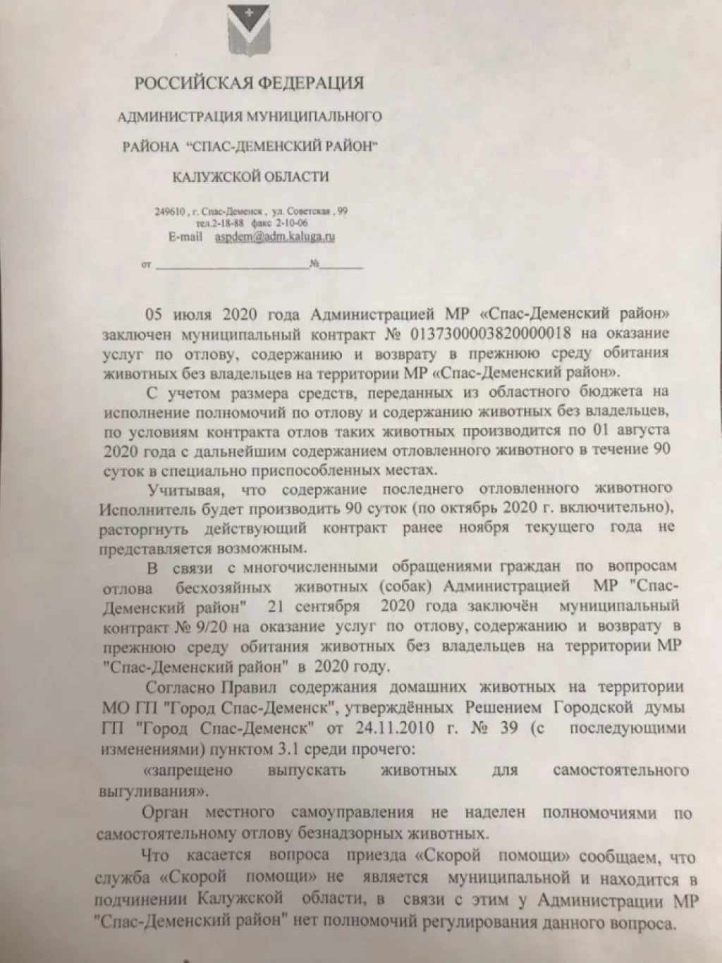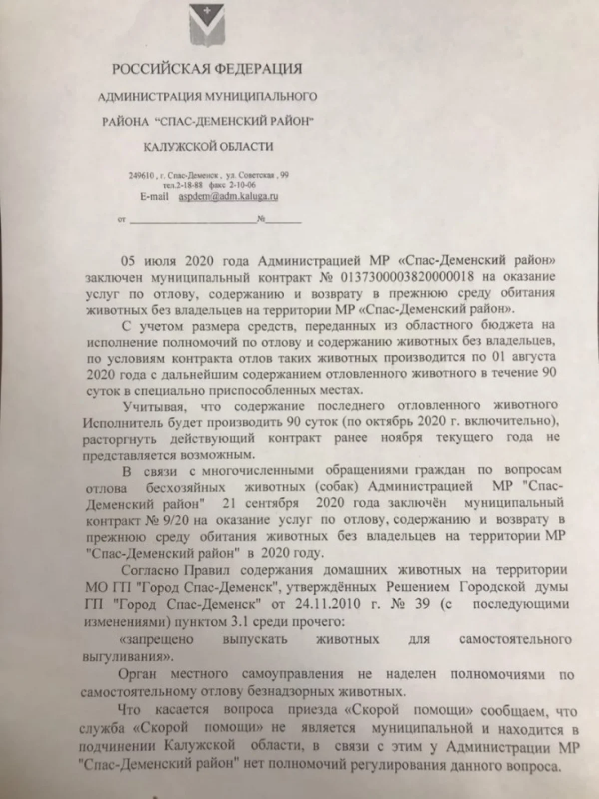 Вот уже несколько дней по улицам города Спас-Деменска разгуливает стая собак, нападает на людей, кусает. Пострадавших уже несколько, случаи зафиксированы в скорой помощи, а также местным участковым (у которого, к слову даже фото есть собак). Местные власти по данному вопросу дали ответ (прикладываю). И никто ничего не делает....