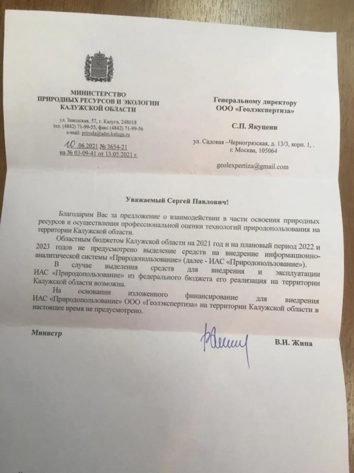 В своё время к Администрации Калужской области обратилась вполне себе серьёзная организация,с предложением организовать и внедрить систему цифрового мониторинга природных ресурсов,причём за собственные средства,чтобы потом передать области.Но местные министры ,не готовы делиться ,и без распила бюджета с их участием,любая тема становиться не интересной и даже вредной.В доказательство прикладываю документ,лично подписаный господином Жипой....Так что рыба ,это только начало