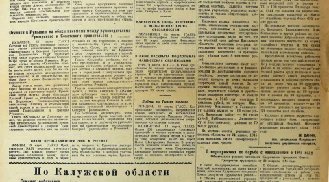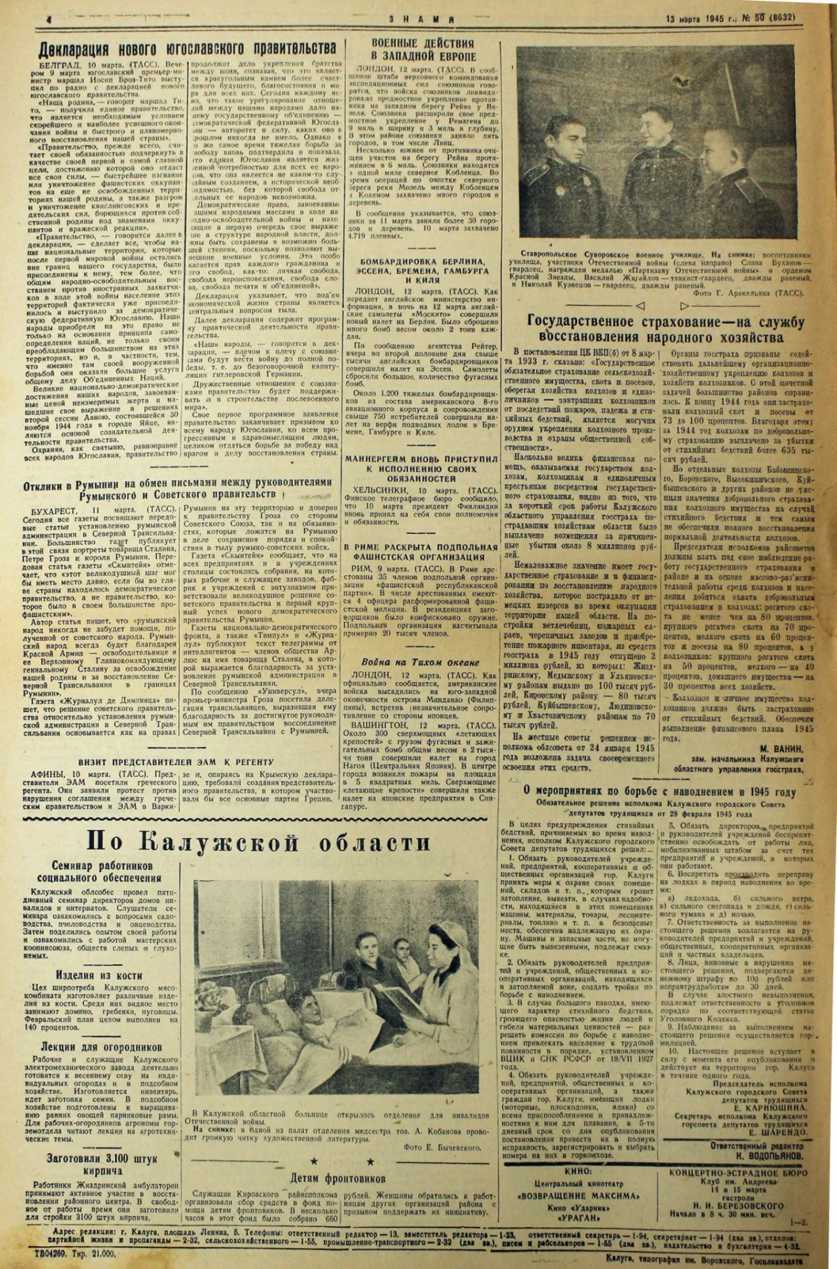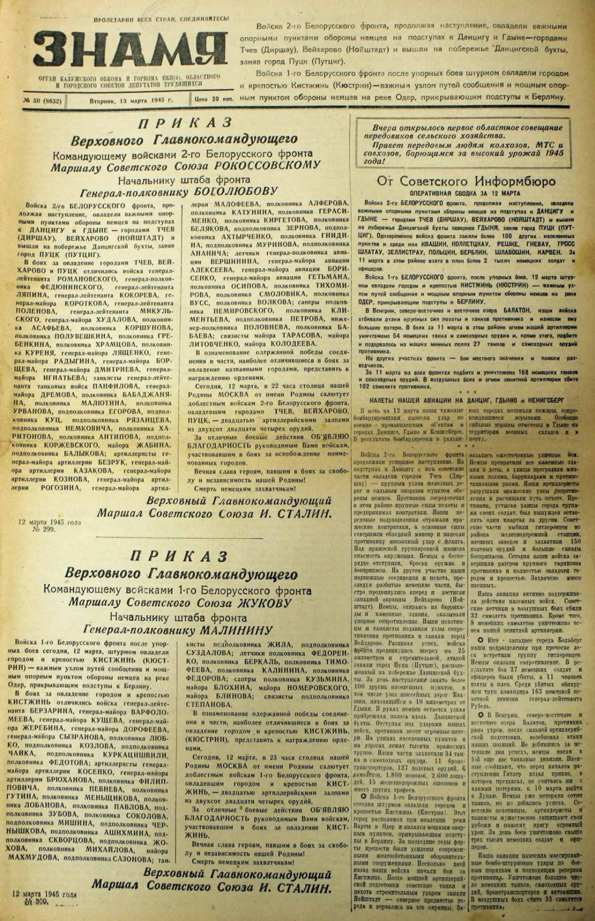 13 марта: Наступление по всем фронтам продолжается. Взят в плен комендант крепости Кистжинь полковник Крюгер. А в Калуге вовсю идет подготовка к посевной.
