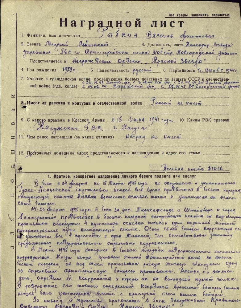Звание: мл. лейтенант, в РККА с 15.06.1941 года Место призыва: Калужский ГВК, Тульская обл., г. Калуга.