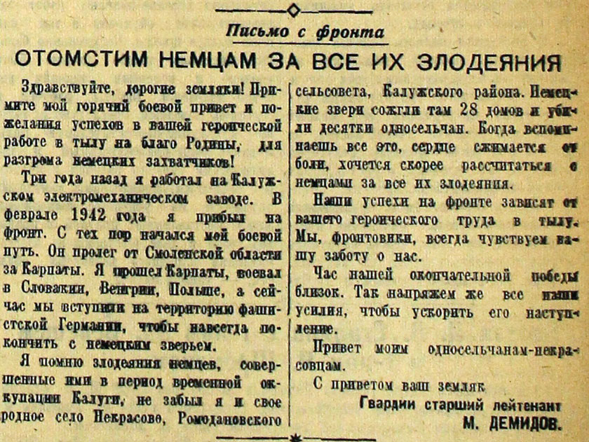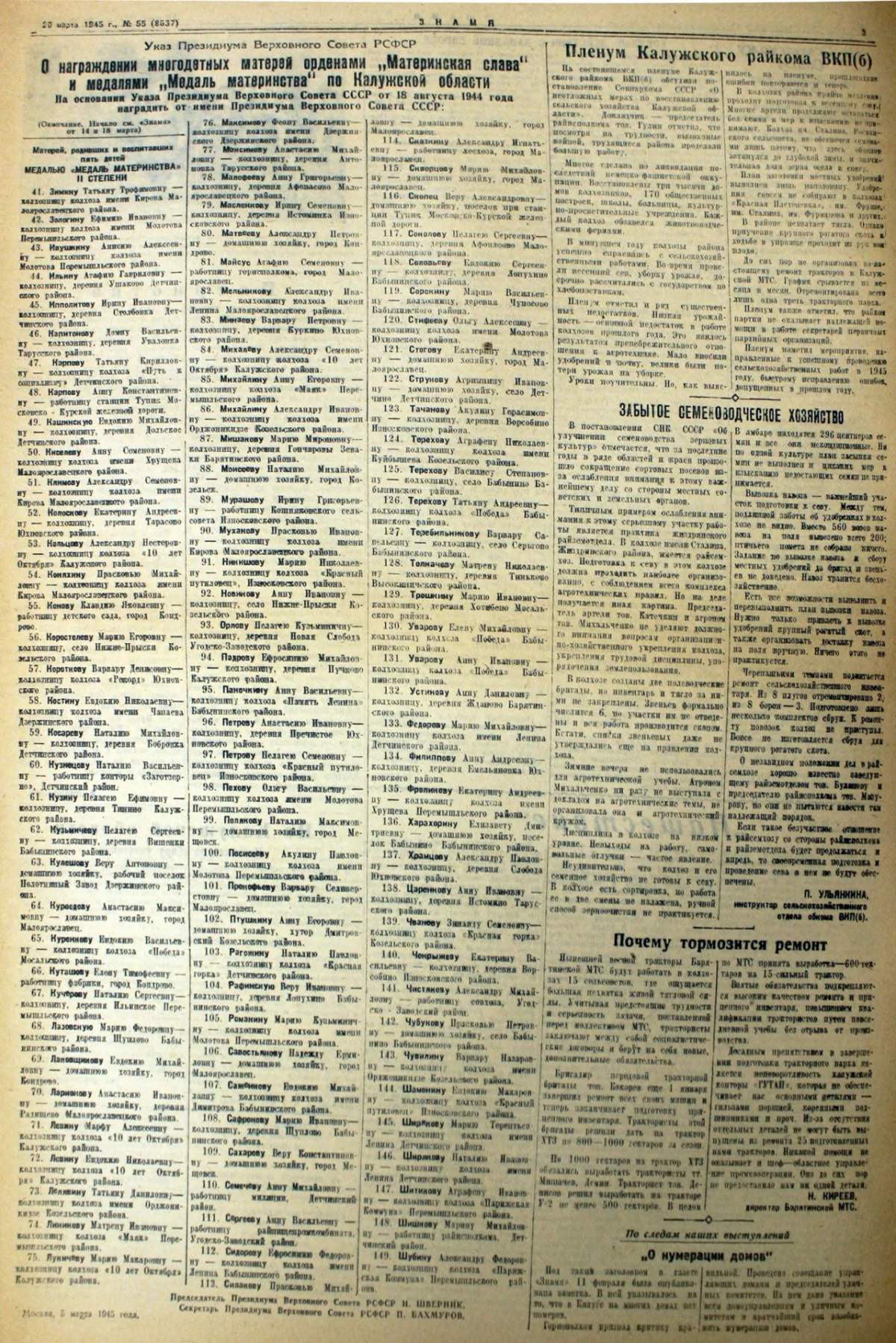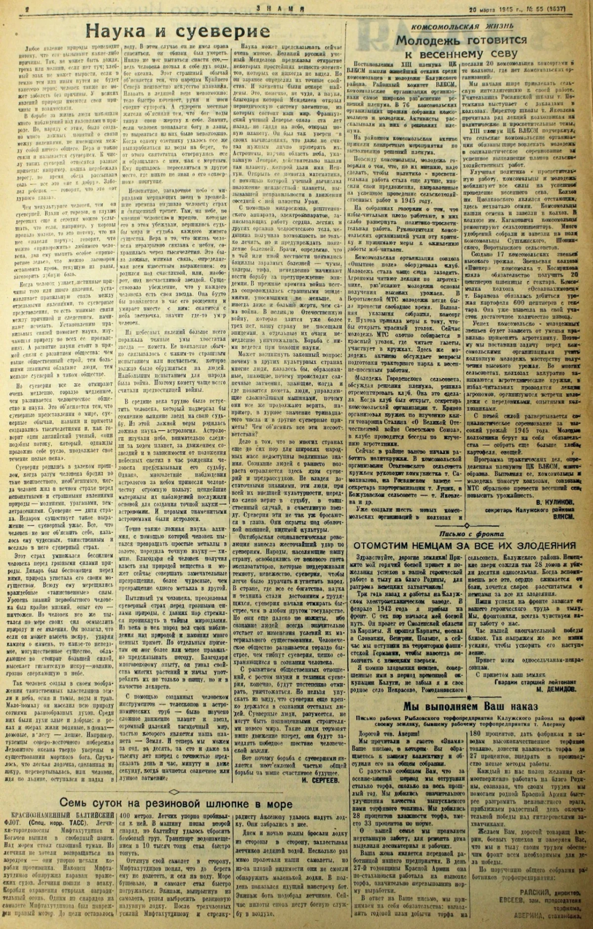 «В Калужском районе успешно прошел месячник по сбору удобрений, организованный по решению райкома комсомола. Лучше других месячник провели комсомольцы колхоза им. Циолковского Кожуховского сельсовета. Комсомолки Клавдия Чуенкова и Клавдия Пантелеева организовали звено по сбору местных удобрений. С мешками и ведрами члены села ходили из дома в дом, собирая золу и куриный помёт. В результате собрано 2 тонны золы и 3 тонны куриного помета.»