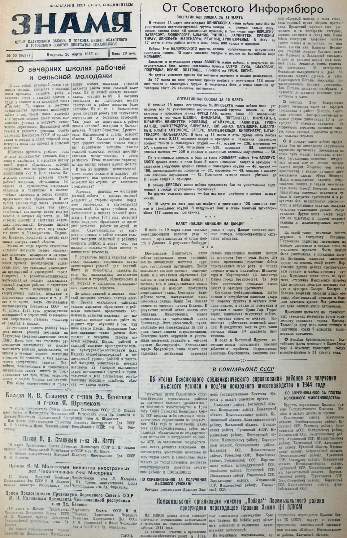 20 марта: В заливе Фриш-Гаш 3-й Белорусский фронт продолжает наступление. Взят город Браунсберг. Войска 1-го Белорусского фронта заняли город Альтдам. В Калуге подводят итоги месячника по сбору удобрений
