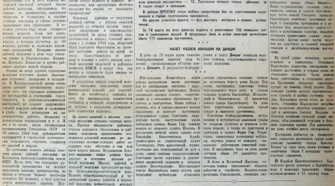 За 20 марта на всех фронтах подбито и уничтожено 176 немецких танков. В воздушных боях и огнём зенитной артиллерии сбито 69 самолётов противника.
