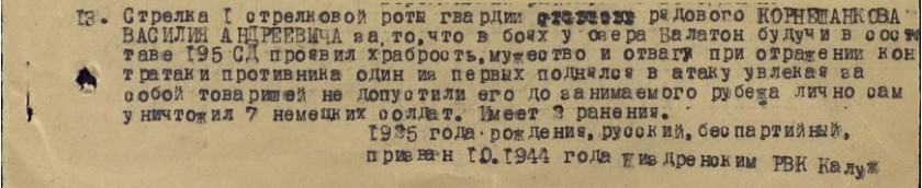 Звание: гв. рядовой, в РККА с 10.1944 года. Место призыва: Жиздринский РВК.