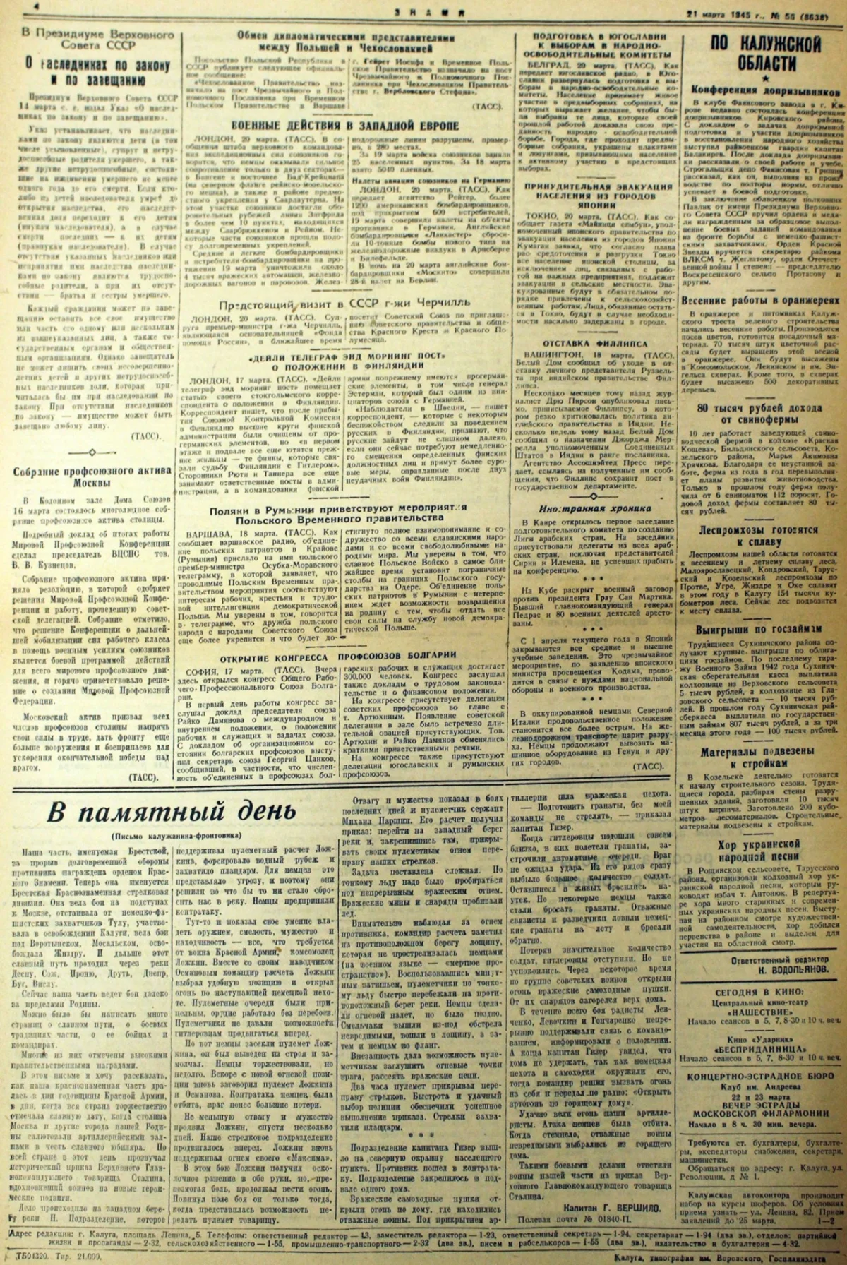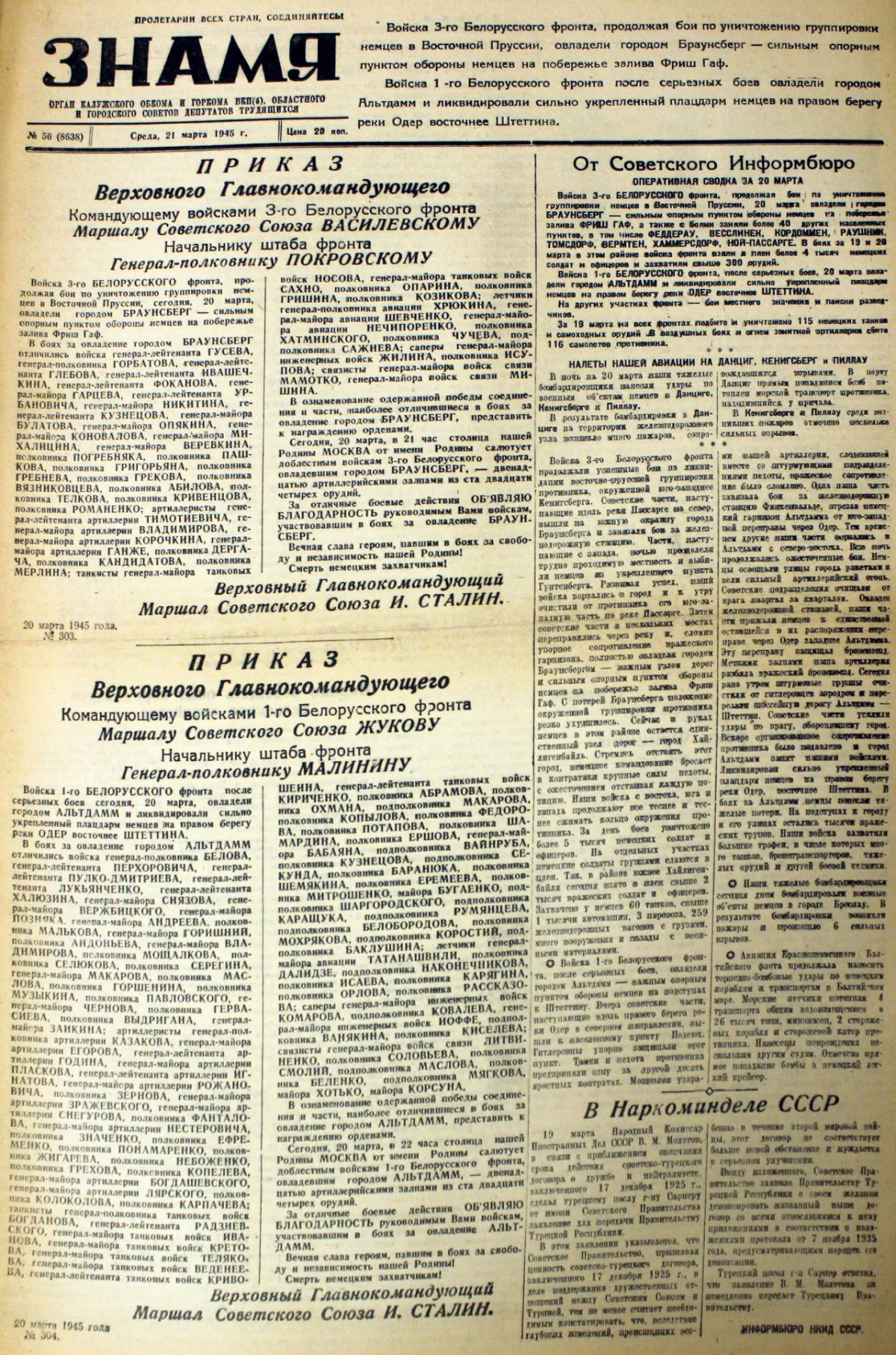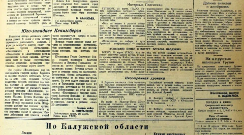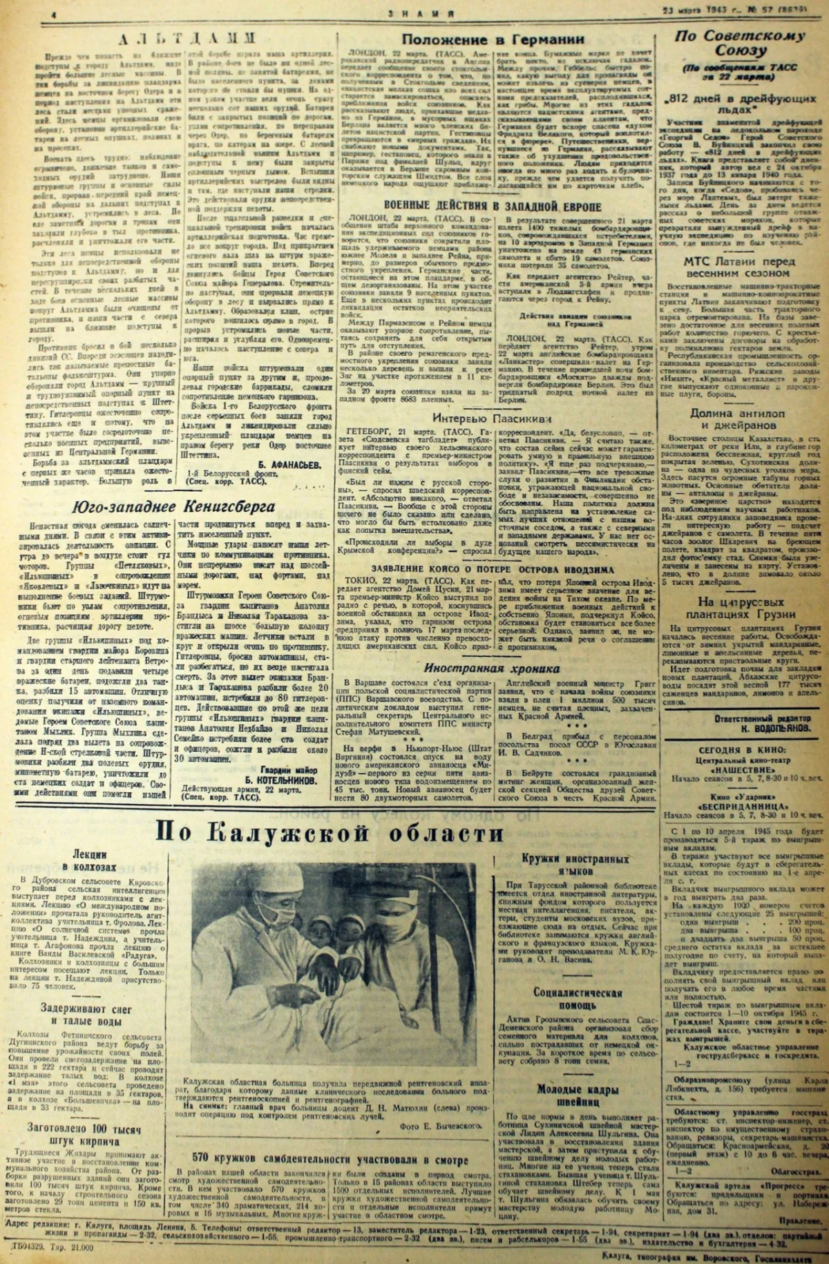 21, 22, 23 марта: Войска 2-го Белорусского фронта вышли на побережье Данцигской бухты между Гдыней и Данцигом, разрезав группировку немцев на две части. В Калуге сажают цветы.