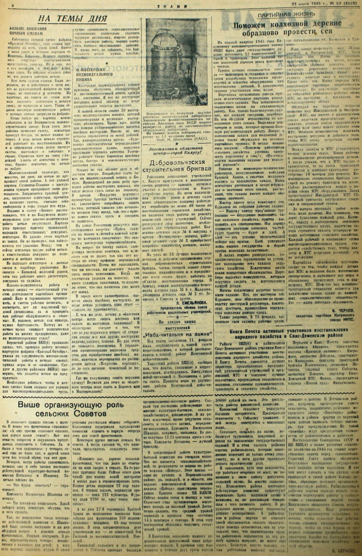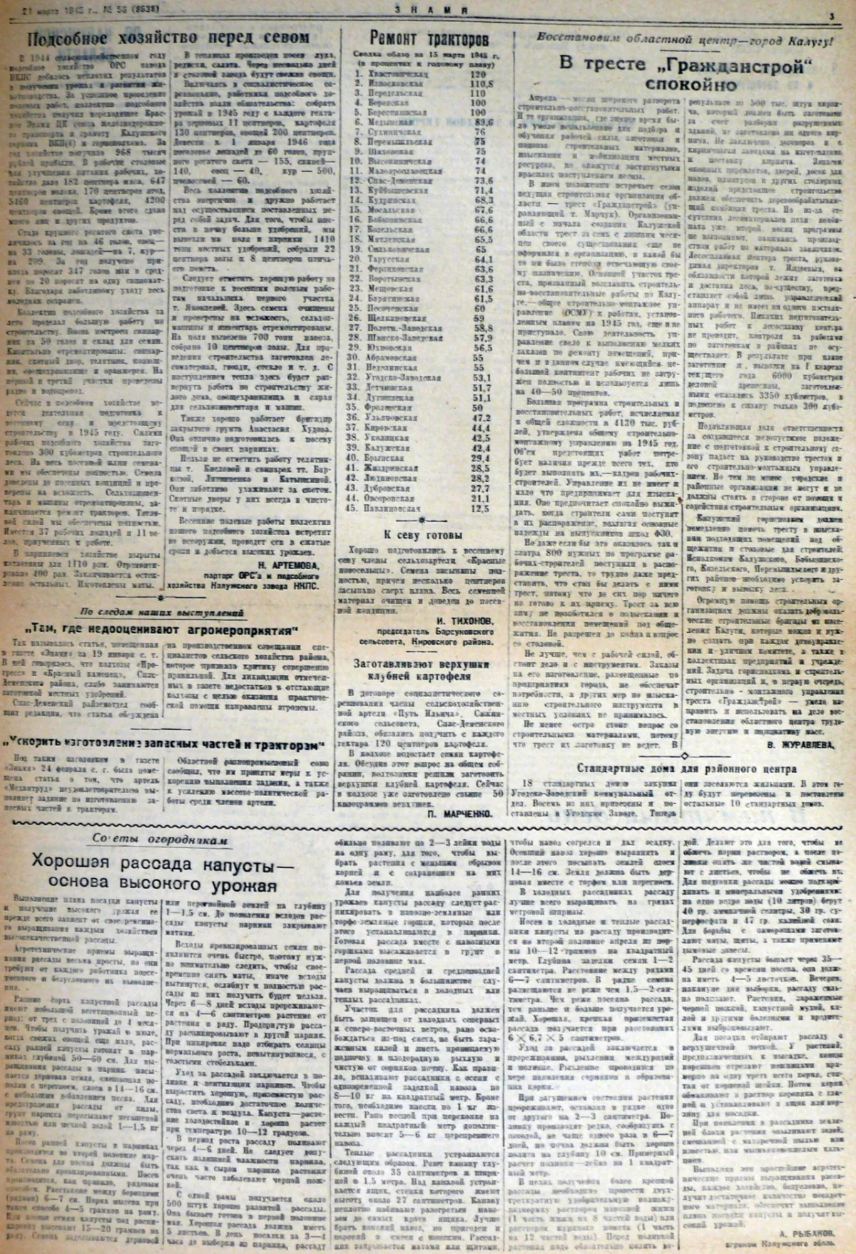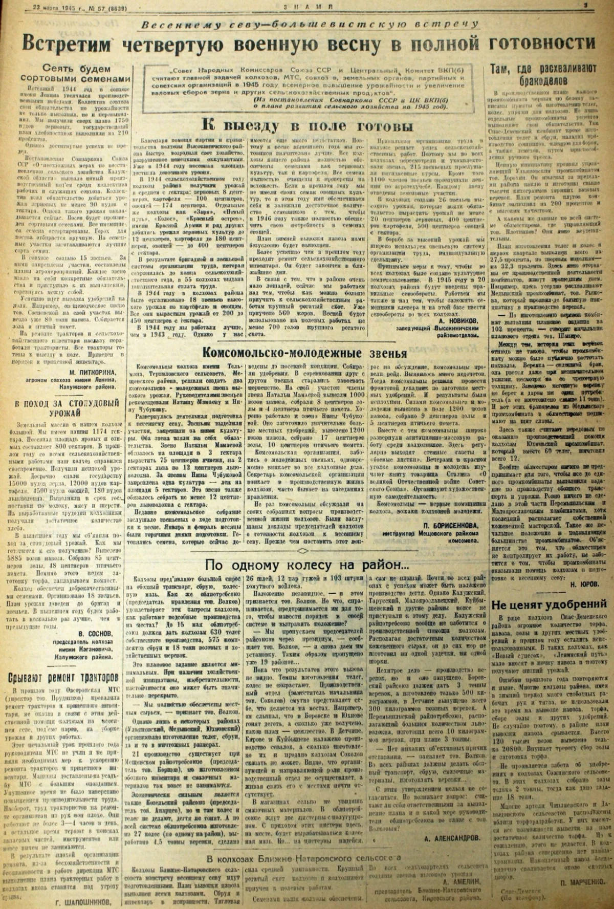 В этот день областная газета «Знамя» рассказала о начале посадок цветов в оранжереях «Калужского треста». Согласно данным газеты, высажено 70 тысяч штук цветочной рассады. А в скверах трес обещал в 1945 году посадить 500 декоративных деревьев.