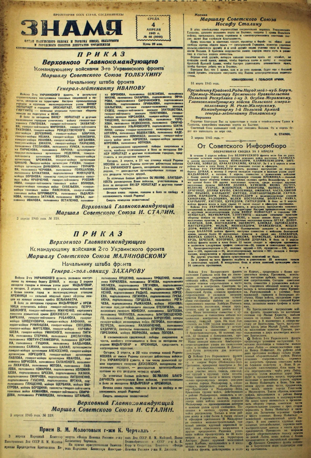Войска 2-го Украинского фронта штурмом овладели важным промышленным центром и главным городом Словакии Братислава, а также заняли на территории Чехословакии более 60 других населённых пунктов. Одновременно войска фронта севернее Братиславы преодолели горы Малые Карпаты.