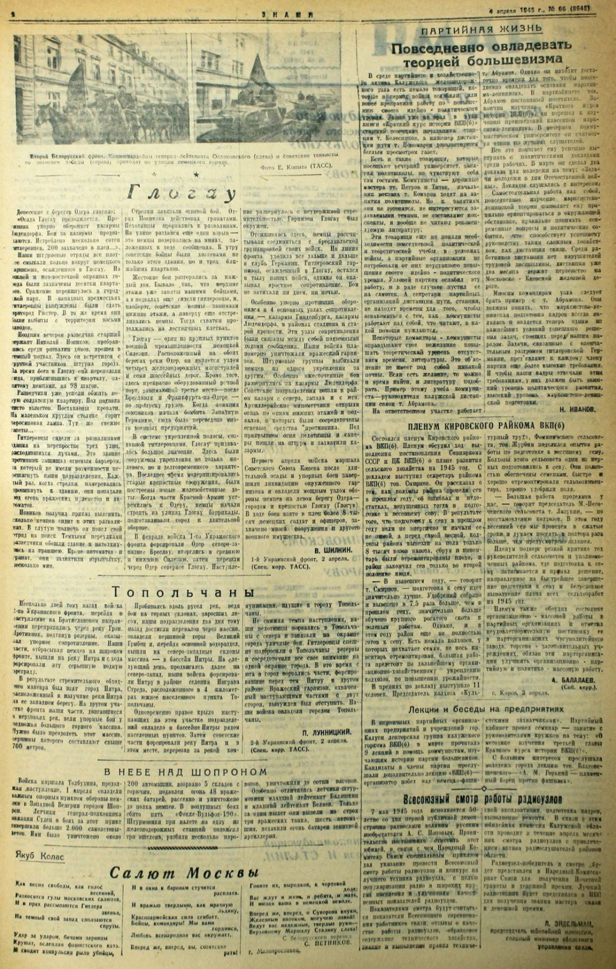 В районе Бреслау наши войска вели бои по уничтожению окружённой группировки противника и заняли пригороды Клейн Мохберн, Клейн Гандау, Козель, судостроительный завод и западный аэродром, на котором захвачено 27 самолётов.
