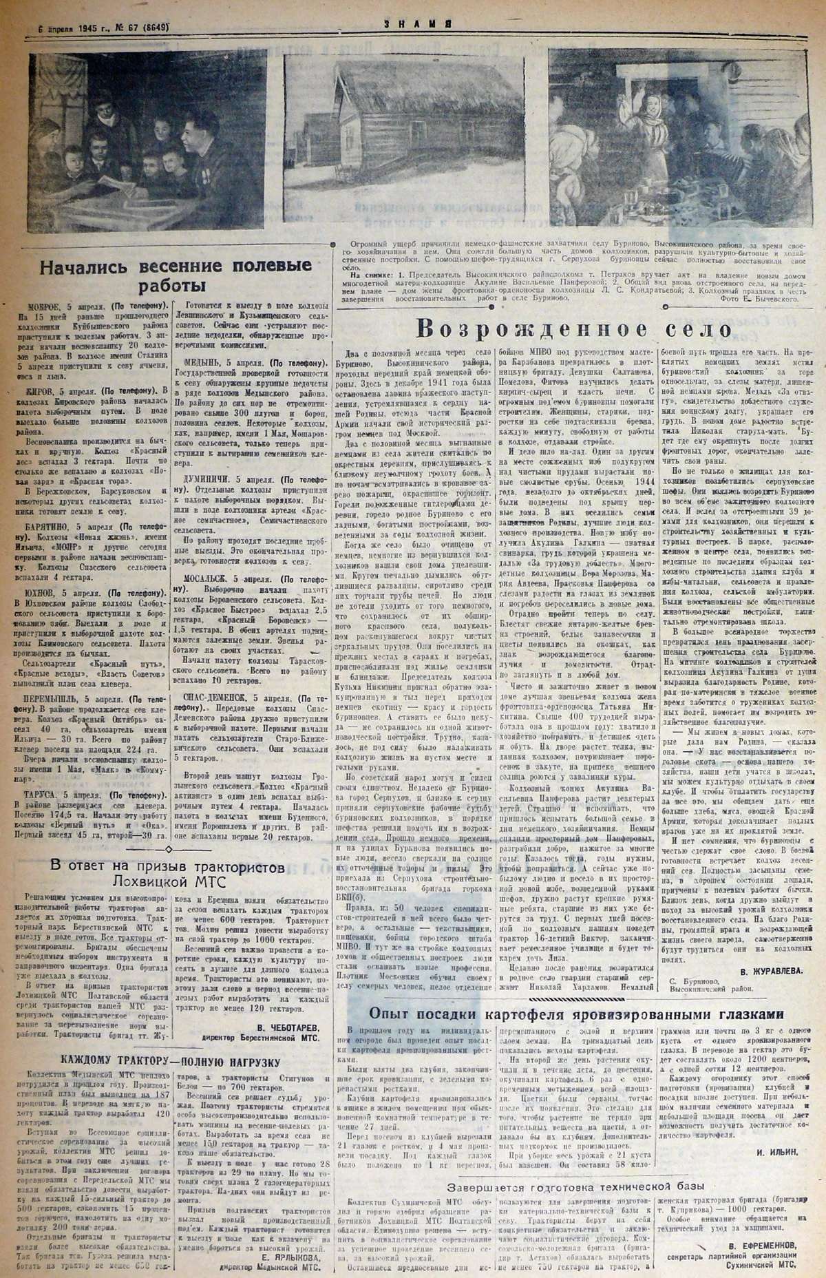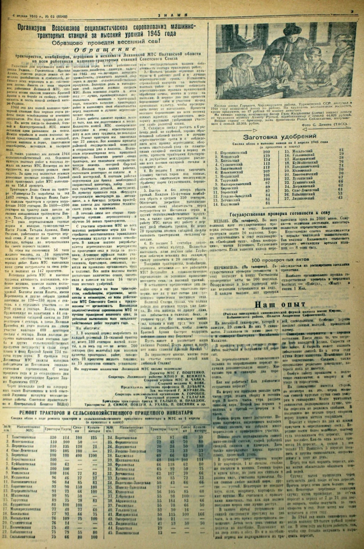 Колхозы области начали посевную. Причем, раньше срока. Сводку с полей приводит газета «Знамя». 5 апреля, на полмесяца раньше срока, в поля вышли колхозники большинства районов области.