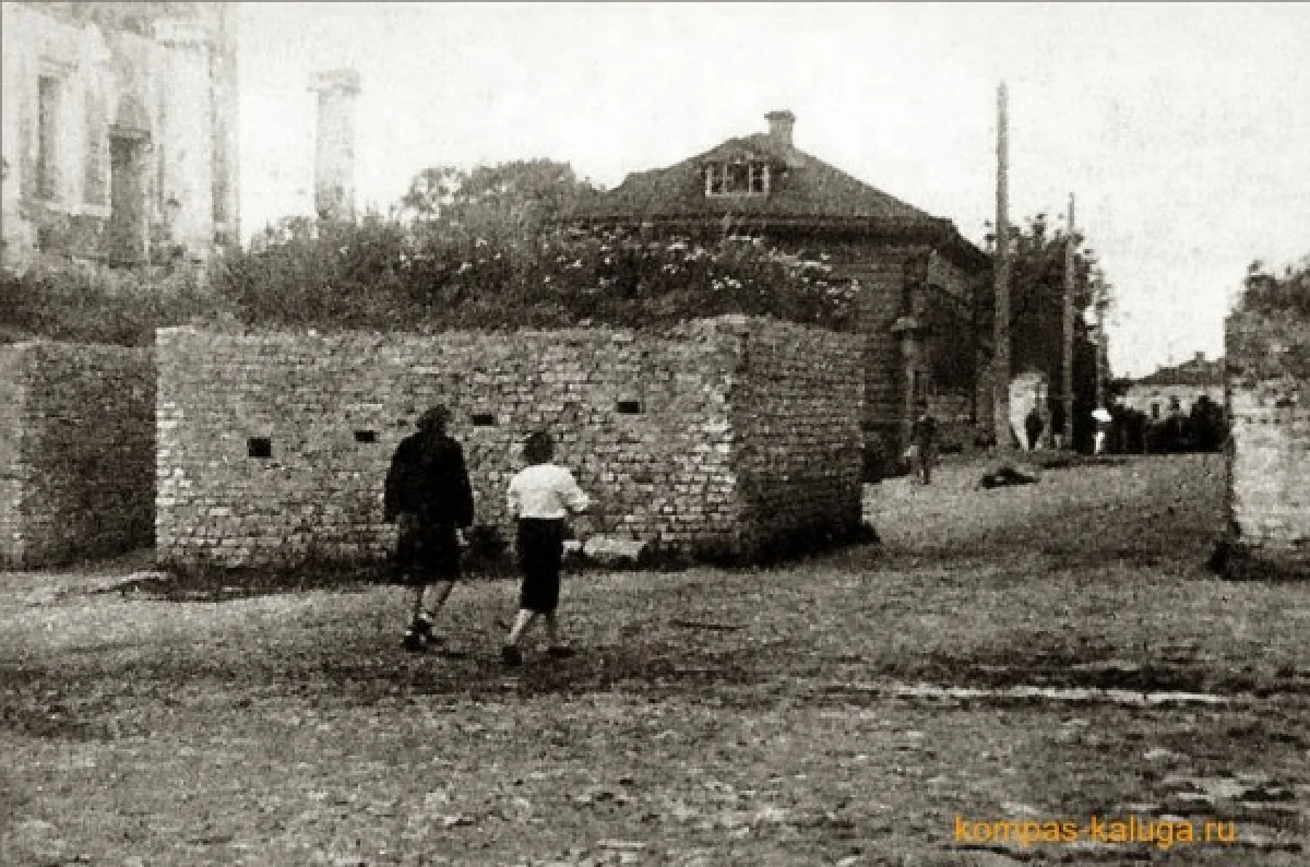 На фото: июнь 1942 года, улица Красноармейская (17 августа 1955 года переименована в улицу Кутузова). На дороге стоят оборонительные сооружения. Слева видны останки Ильинской церкви, которая до нашего время не сохранилась. В советское время на её месте построили ателье, а сейчас в этом здании рядом с Калужским районным судом расположен банк.
