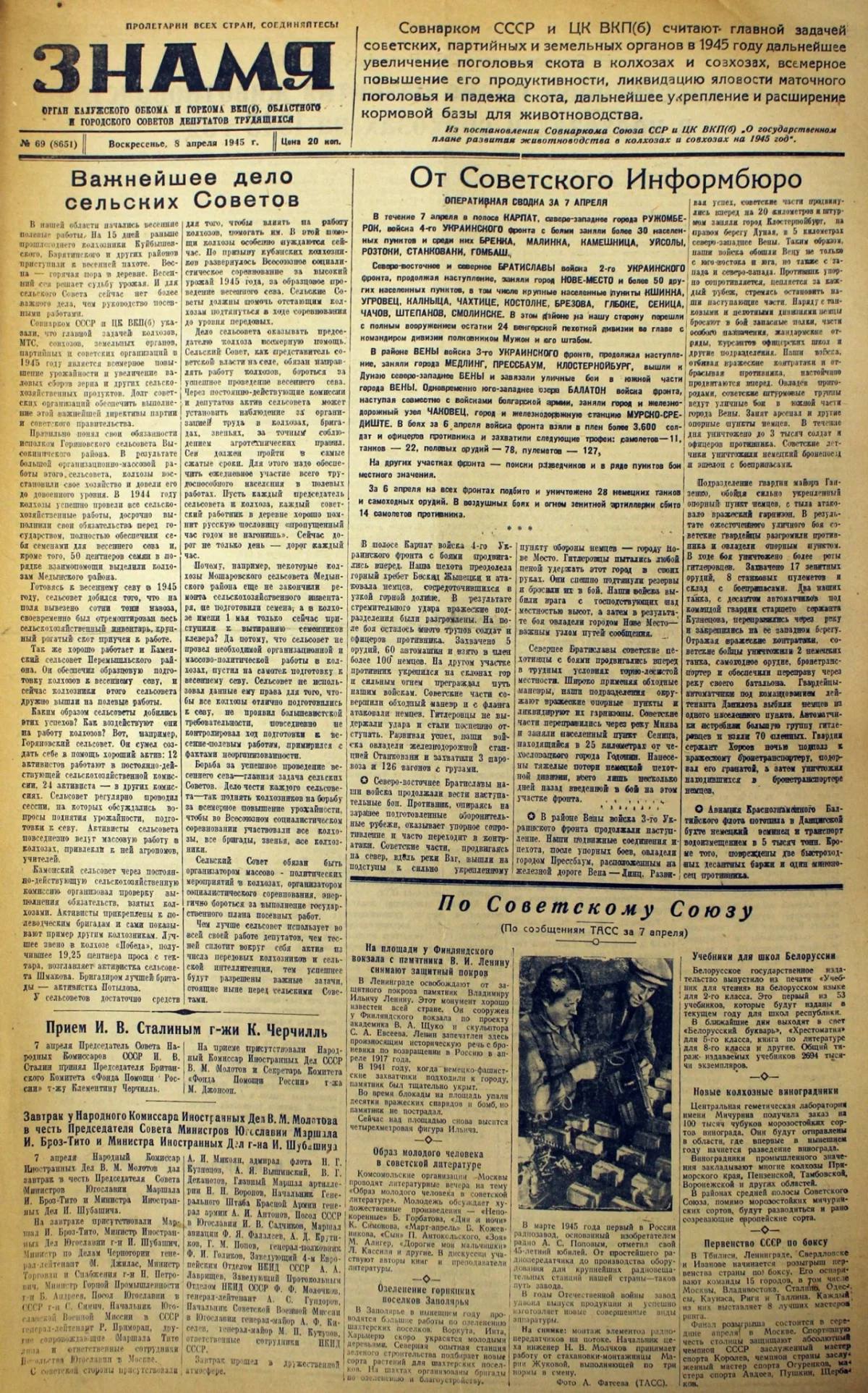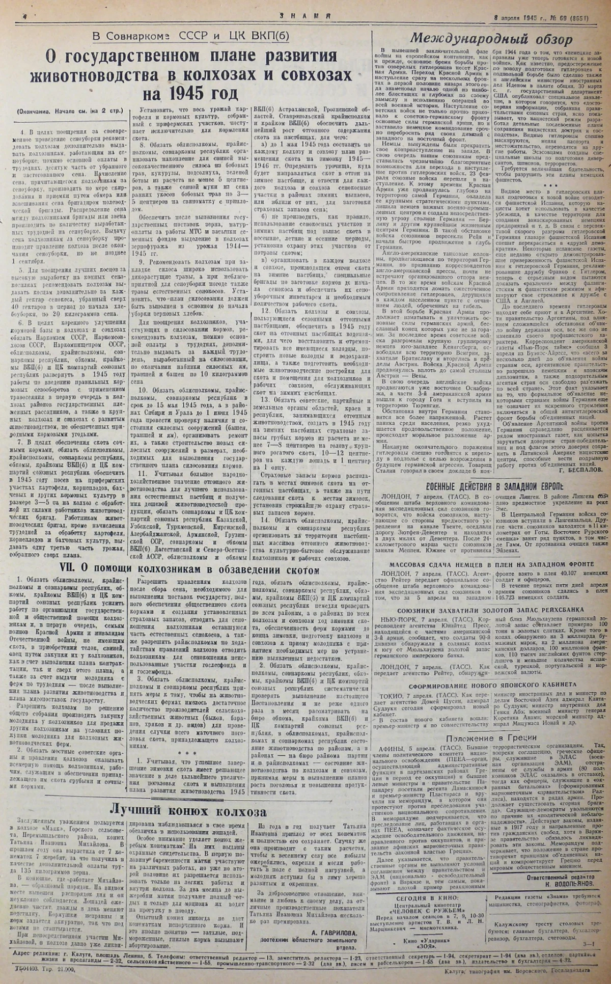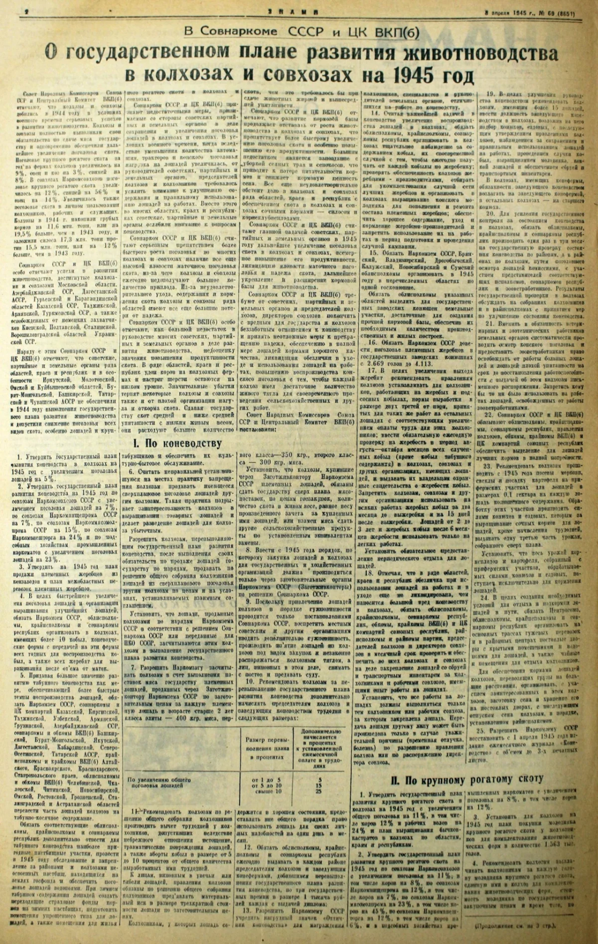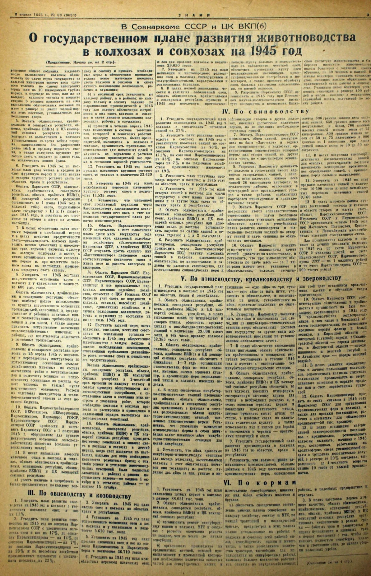 Подавляющее большинство газетного номера от 8 апреля занял госплан развития колхозов и совхозов на 1945 год, так что места для местных новостей у «Знамени» практически не осталось. Однако редактор нашел возможность на последней странице отметить заслуги конюха из колхоза «Маяк» Перемышльского района, которая отличилась в выхаживании жеребят.