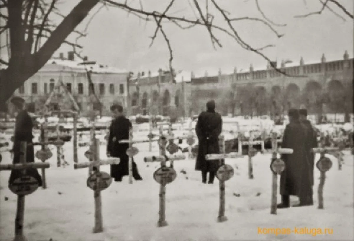 На фото: декабрь 1941 года, во время оккупации города — немецкие солдаты ходят среди могил своих соотечественников на кладбище устроенном в сквере Ленина. Позже тут же будут похоронены и красноармейцы, погибшие при освобождении Калуги.