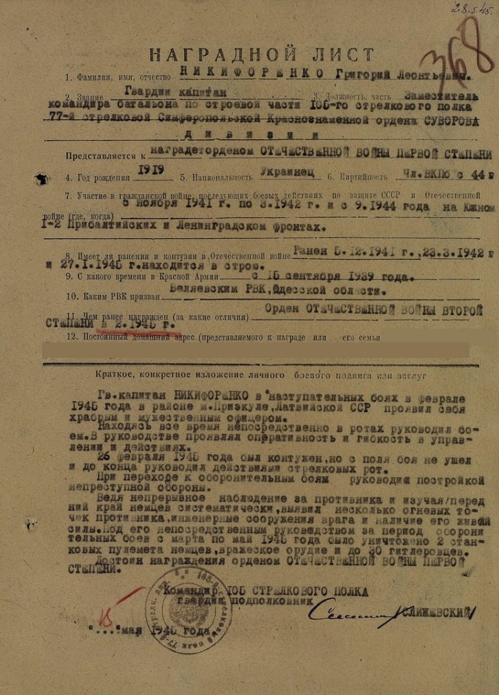 Оказалось, украинец Никифоренко, призванный из Одесской области, особо отличился при освобождении Литовской ССР и Латвийской ССР. За бои с фашистами в первой республике он получил орден Отечественной войны II степени, а за заслуги в освобождении второй - Орден Отечественной войны I степени.